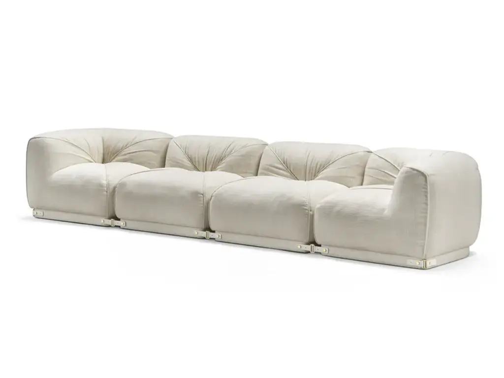A modular three-seater sofa featuring two base elements connected by a belt with a brass buckle detail. The sofa offers a deep, comfortable seat with soft, ample curves that enhance relaxation and create a welcoming atmosphere. Its design balances functionality with refined aesthetics, making it suitable for various living spaces.