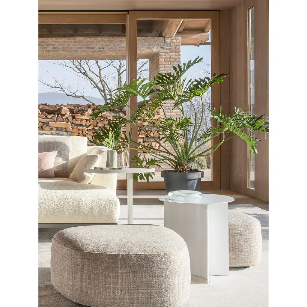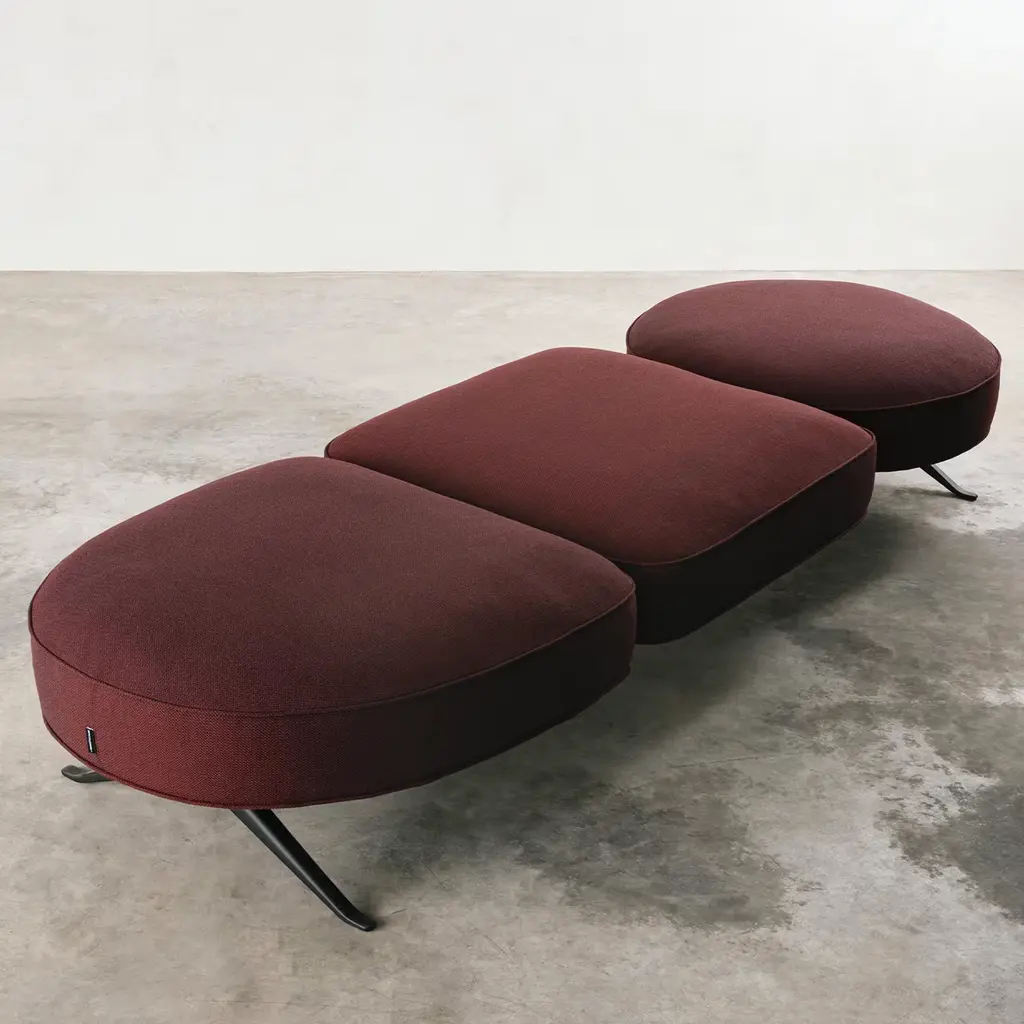 Luizet is a modular sofa system that invites to combine together various elements. An arched angular piece, a central square and a circular one, available both as a table and as a pouf, are the foundation for a variety of settings. Supported by a discrete and elegant metal frame, the three modules can be juxtaposed and mixed with the addition of cylindrical and rectangular cushions for the backrest. From a classic three seater sofa to a number of wider and more complex solutions.