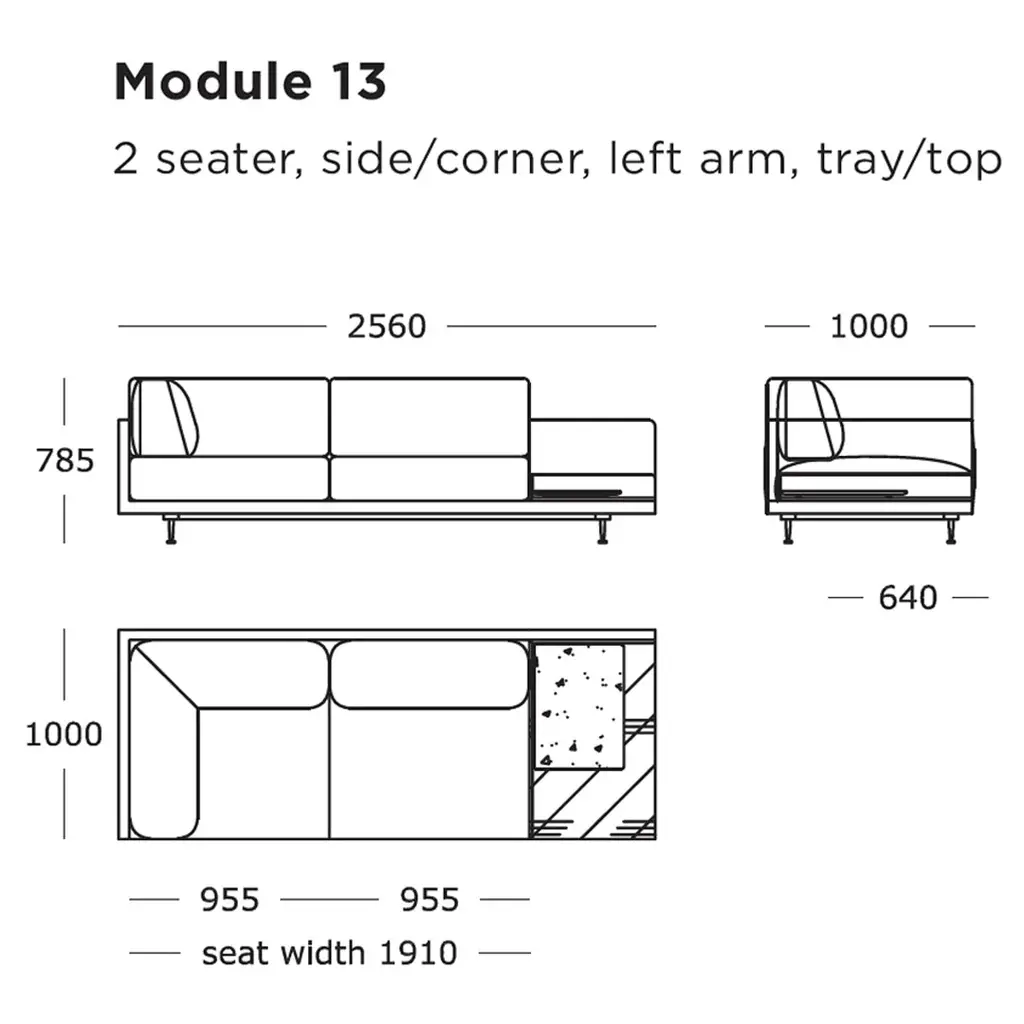 Each module sold separately. Drawn with dimensions that exude comfort, depth and modern elegance, the Maho Sofa is a study in lounging a true retreat for days of slowing down, enhanced through loose cushions with down fill. Crafted as a voluminous low-lying lounge design, the Maho Sofa rests atop a slim and sharply defined frame in black powder-coated steel. The design is available in two seat heights and a range of upholstery options from Wendelbo's curated edit of textiles and leathers. Spanning 43 modules, the design offers a high degree of customizability, further accentuated by complementing design elements in the shape of trays in walnut veneer with a Grey Emperador marble top.