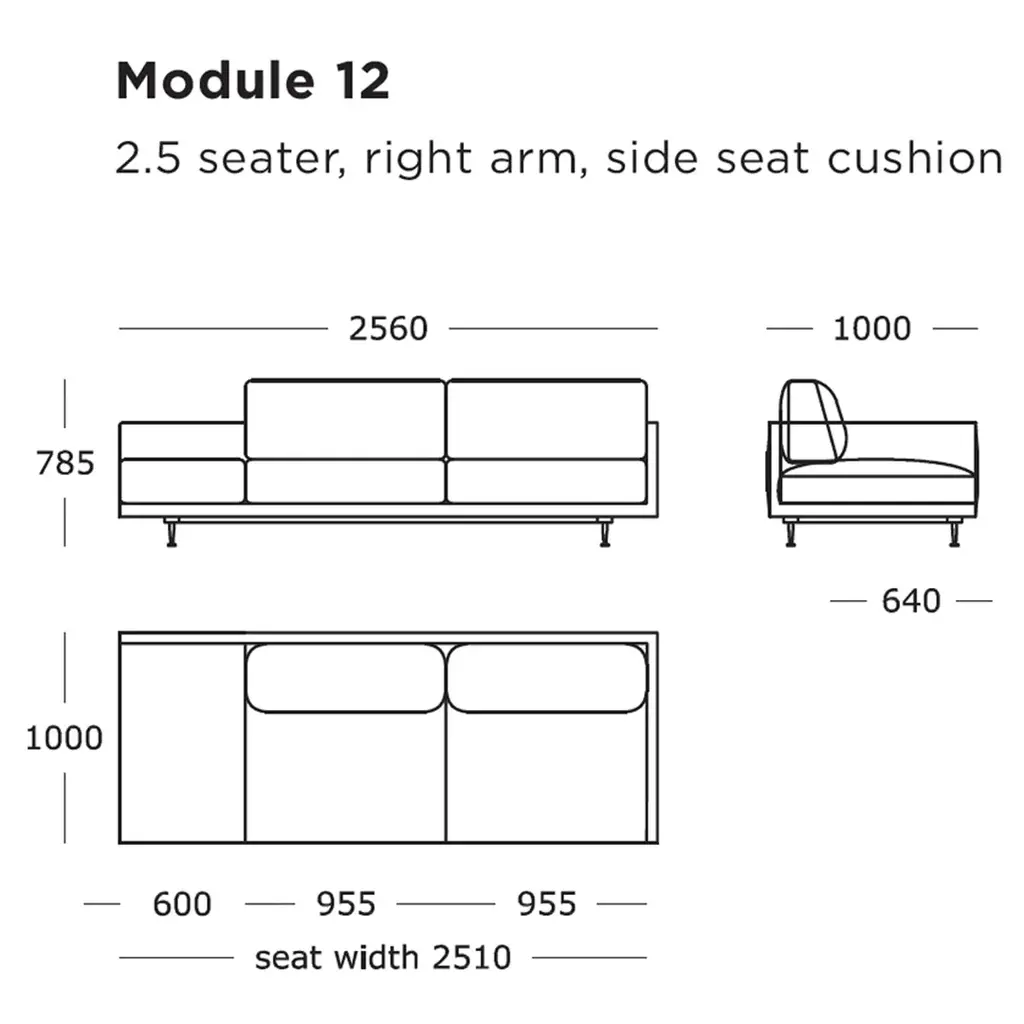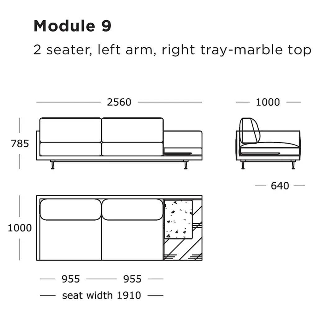 Each module sold separately. Drawn with dimensions that exude comfort, depth and modern elegance, the Maho Sofa is a study in lounging a true retreat for days of slowing down, enhanced through loose cushions with down fill. Crafted as a voluminous low-lying lounge design, the Maho Sofa rests atop a slim and sharply defined frame in black powder-coated steel. The design is available in two seat heights and a range of upholstery options from Wendelbo's curated edit of textiles and leathers. Spanning 43 modules, the design offers a high degree of customizability, further accentuated by complementing design elements in the shape of trays in walnut veneer with a Grey Emperador marble top.
