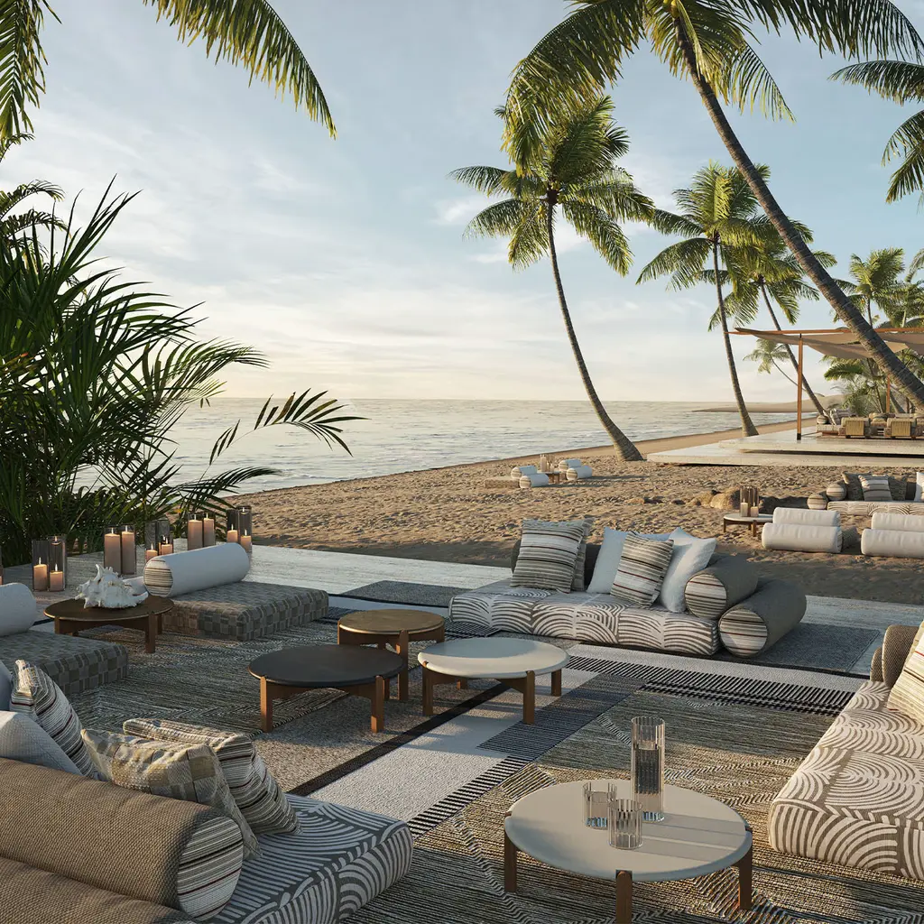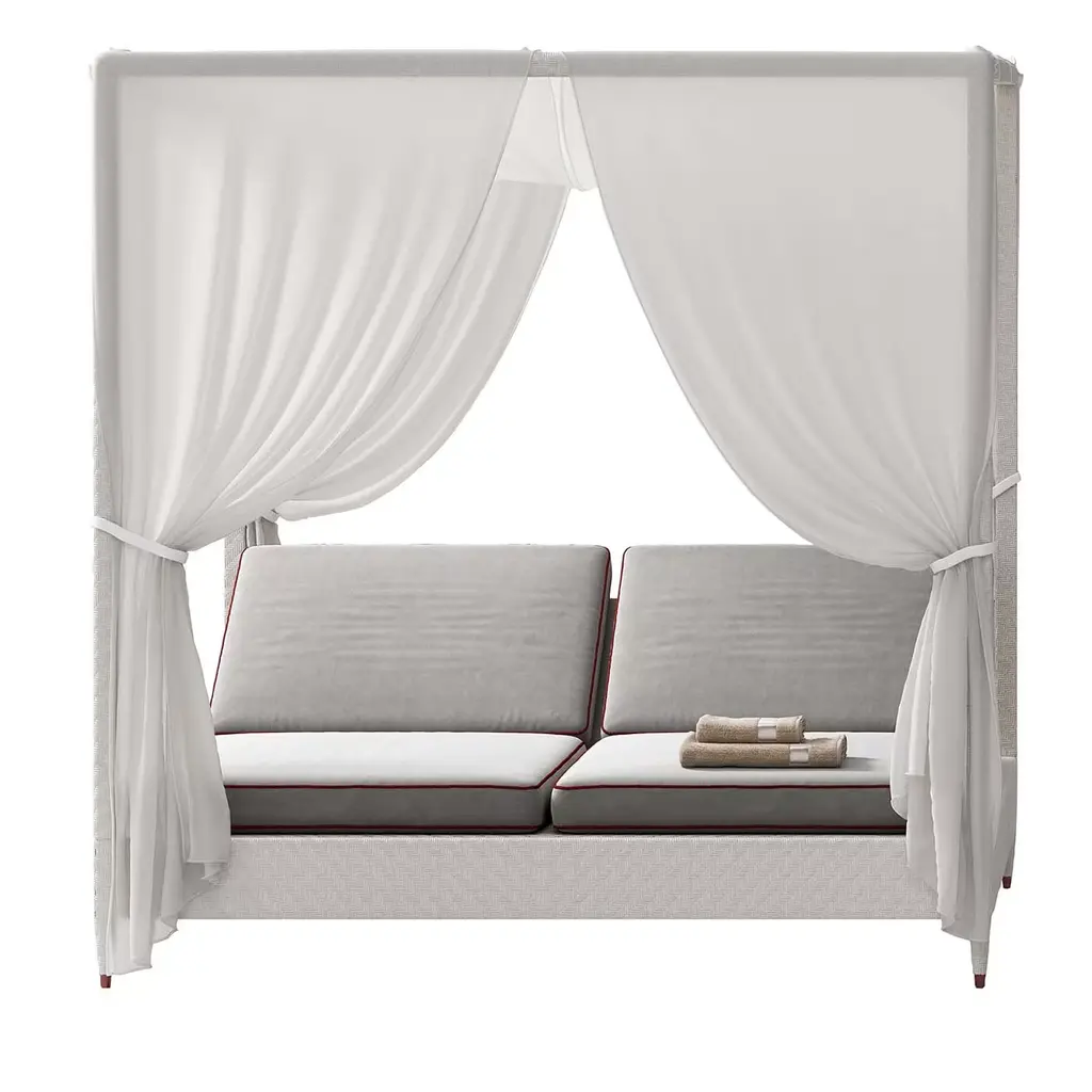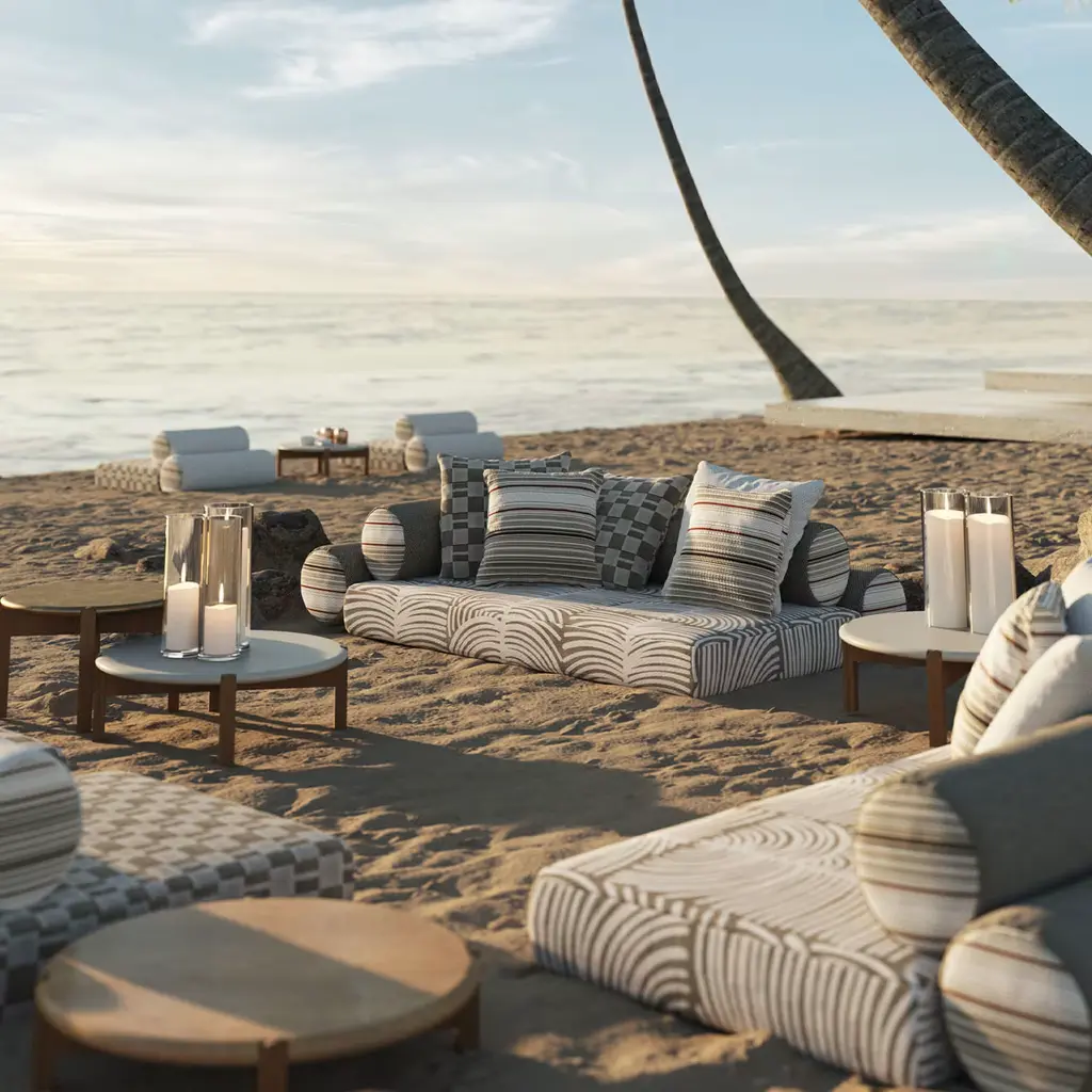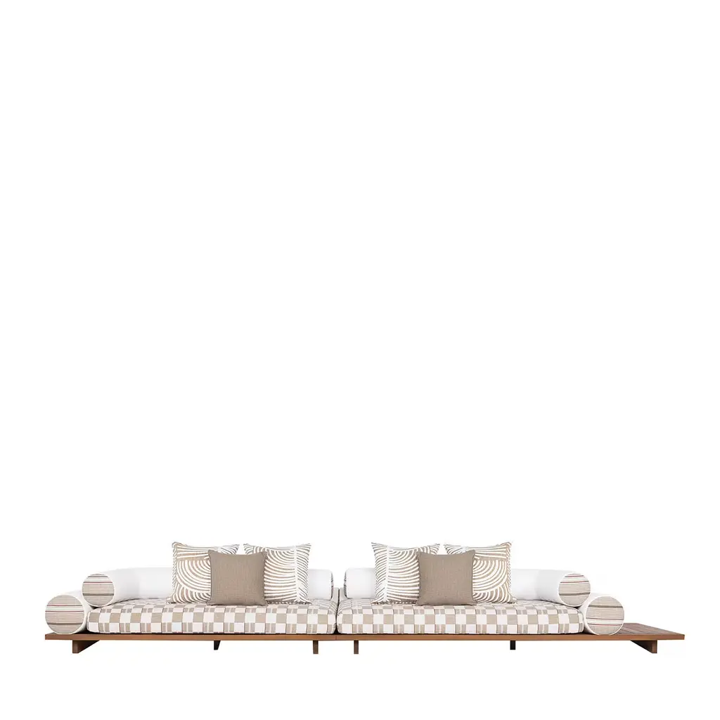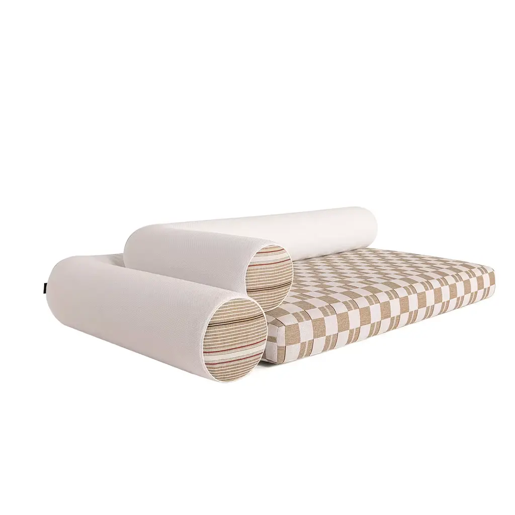 Majlis takes its name from a traditional space is use in Arab countries, dedicated to hospitability and conviviality. It is a modular seating system for outdoor use that features generous dimensions, rounded shapes and exceptional seating comfort. It is characterized by a large seat cushion embraced by two rolls that perform as the backrest, made in different sizes and densities. A breathable water-repellent fabric covers the insert. The price includes the decorative cushions, as shown in the image, and the protective cover for each module.
