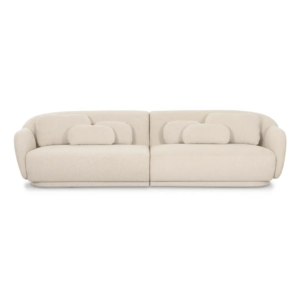 Introducing Misty: This textural sofa is a welcome addition to any home. It doesn't get cozier than this mid-century inspired design, topped with coordinating pill-shaped pillows and upholstered in a delicious cream boucle!