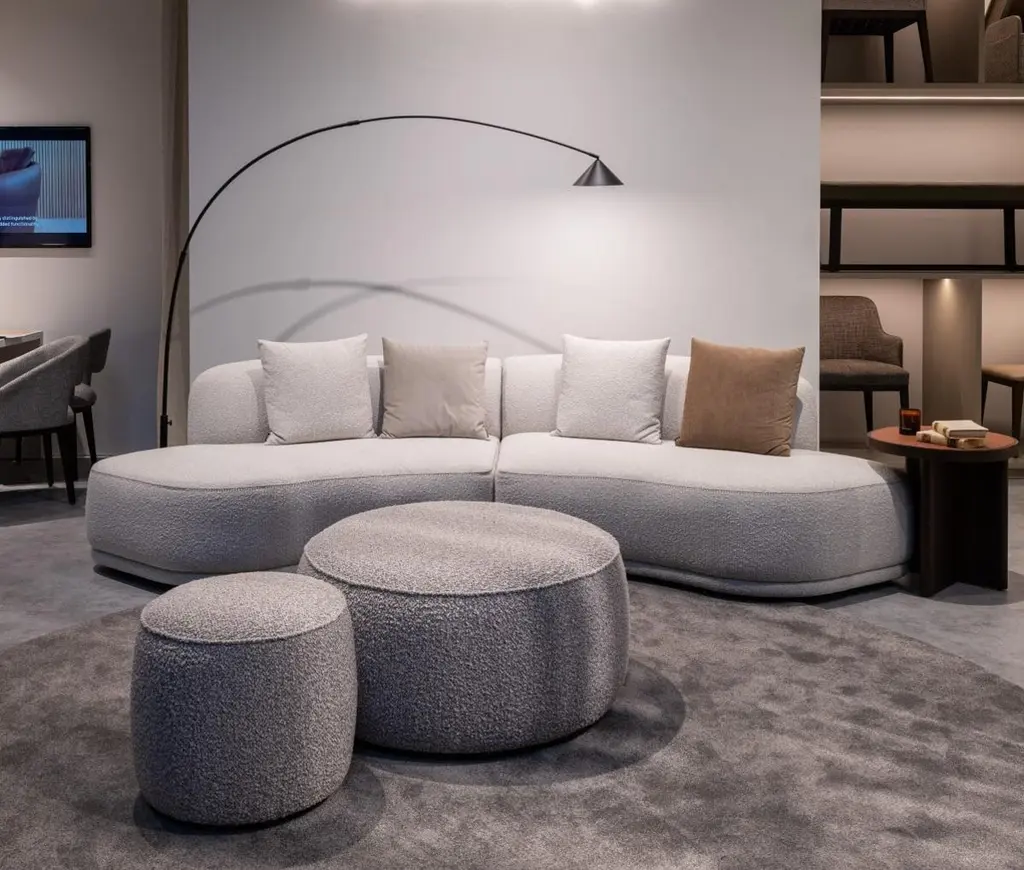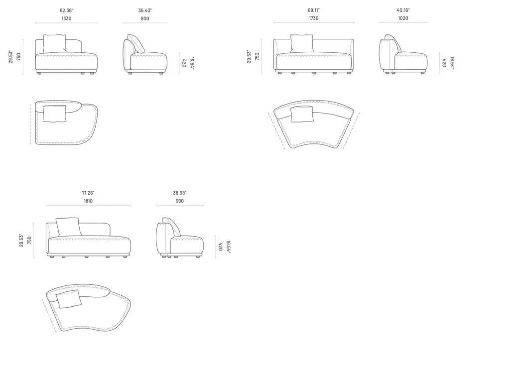 This new addition to the collection of modular sofas includes six unique modules. It stands out for several reasons. Firstly, it is entirely upholstered, including the footer, ensuring a seamless appearance with the seat and back. Additionally, most modules feature a convex back, providing ergonomic comfort for difficult spaces. As a modular piece, it offers versatility, allowing for various configurations. This sofa is a substantial, rounded, and comfortable option for your design needs.We will be glad to check with the factory’s technical team if sizes, finishes, and colors can be customized. We do our best to expedite production and to ship and deliver product within the listed lead time, however current lead times might be longer due to global shipping backlog and delays. These delays are out of our control and cannot be a reason to cancel an order.Our pricing includes all costs for international shipping to the U.S., as well as duties and customs clearance fees. Please be aware that local delivery within the U.S. is not included. We offer white glove, front door, and warehouse delivery options. For shipments outside the U.S., kindly reach out to us for a detailed quote.