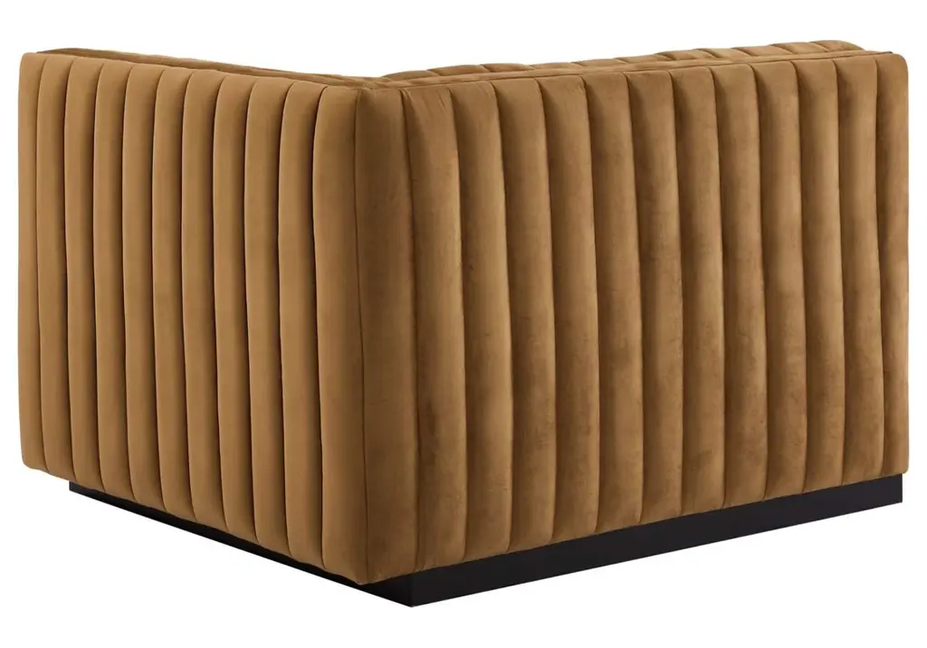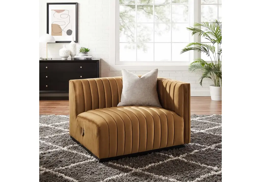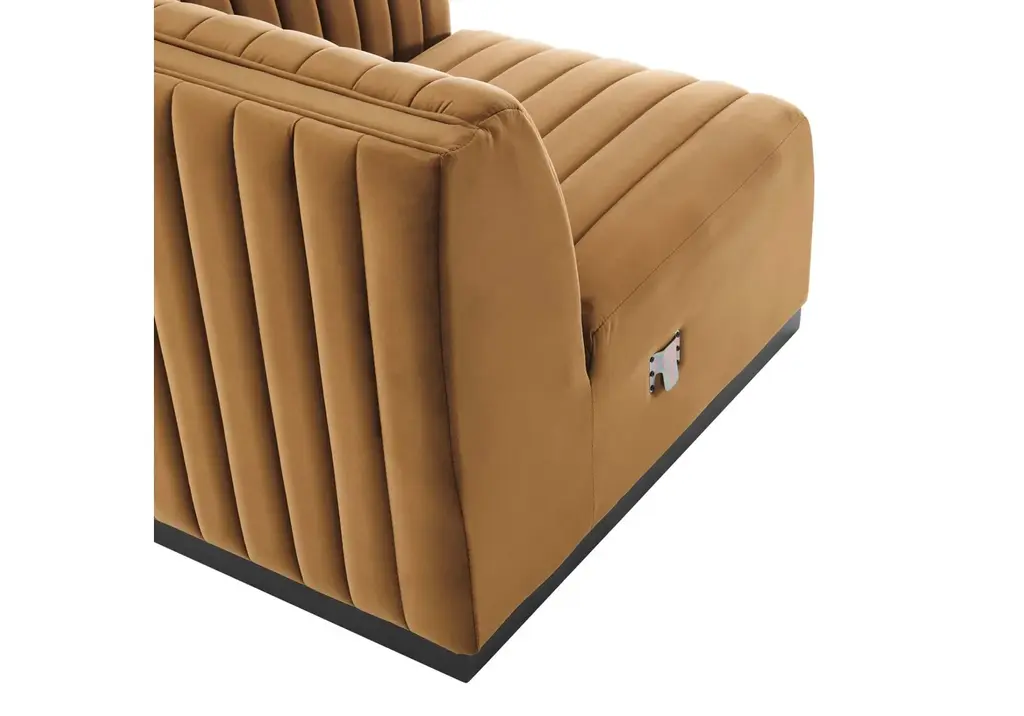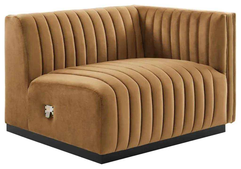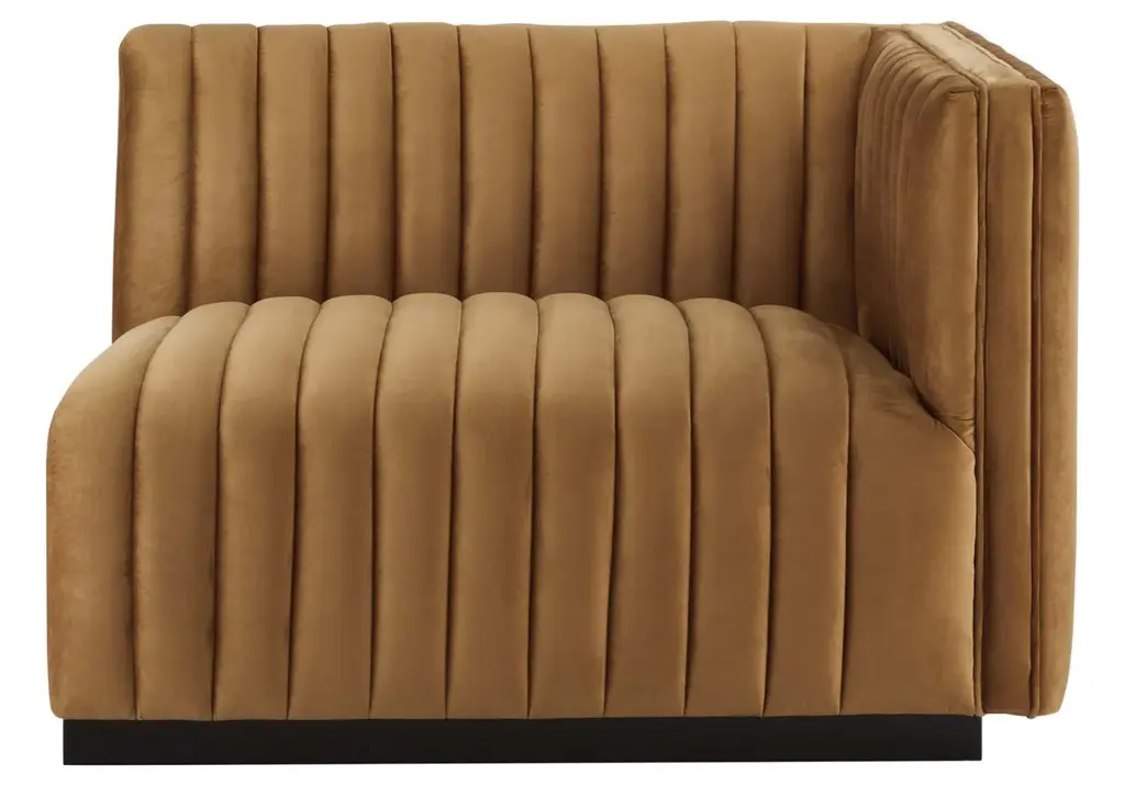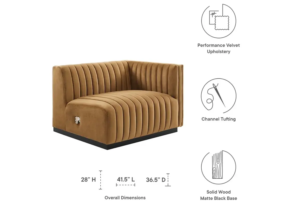 Modern appeal surrounds the Conjure Channel Tufted Performance Velvet Upholstered Right-Arm Chair. Luxuriously soft, stain-resistant performance velvet upholstery covers dense foam padding and an individually wrapped spring coil system for a supportive living room chair that will become the go-to lounge spot for family and friends. Vertical channel tufting and subtle French piping adds depth to this vintage inspired sectional piece that effortlessly becomes the focal point in your living room. Solidly constructed from wood and plywood, this armchair features non-marking foot caps and boasts a matte black base. Versatile and elegant, this sectional sofa piece is ideally suited for a variety of decor styles in your living room, lounge, or home office. Chair Weight Capacity: 331 lbs.Channel Tufting DetailsFrench Piping AccentsPerformance Velvet UpholsteryMatte Black BaseGlam Deco StyleStain Resistant FabricChair Weight Capacity: 331 lbs.Overall Product Dimensions: 36.5"L x 41.5"W x 28"HSeat Dimensions: 24.5"L x 24.5 - 34.5"W x 15.5"HArmrest Dimensions: 36.5"L x 6.5"W x 28"HBackrest Dimensions: 12"W x 12"HSpace Between Armrest and Seat: 12"HBase Dimensions: 34.5"L x 36.5"WWeight (LBS): 59