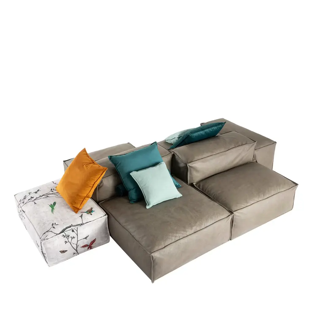 Mood is a sectional sofa perfect for both home and public spaces. Let your imagination run free and create your personal composition by mixing different colors, shapes, and materials. Also available in different fabrics. Item sold as pictured Elements included in the composition. Cushions are included. Please Inquire with the Concierge for further details and customizations.