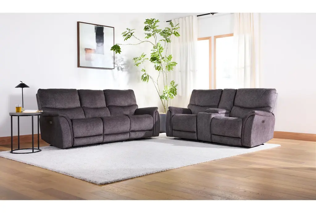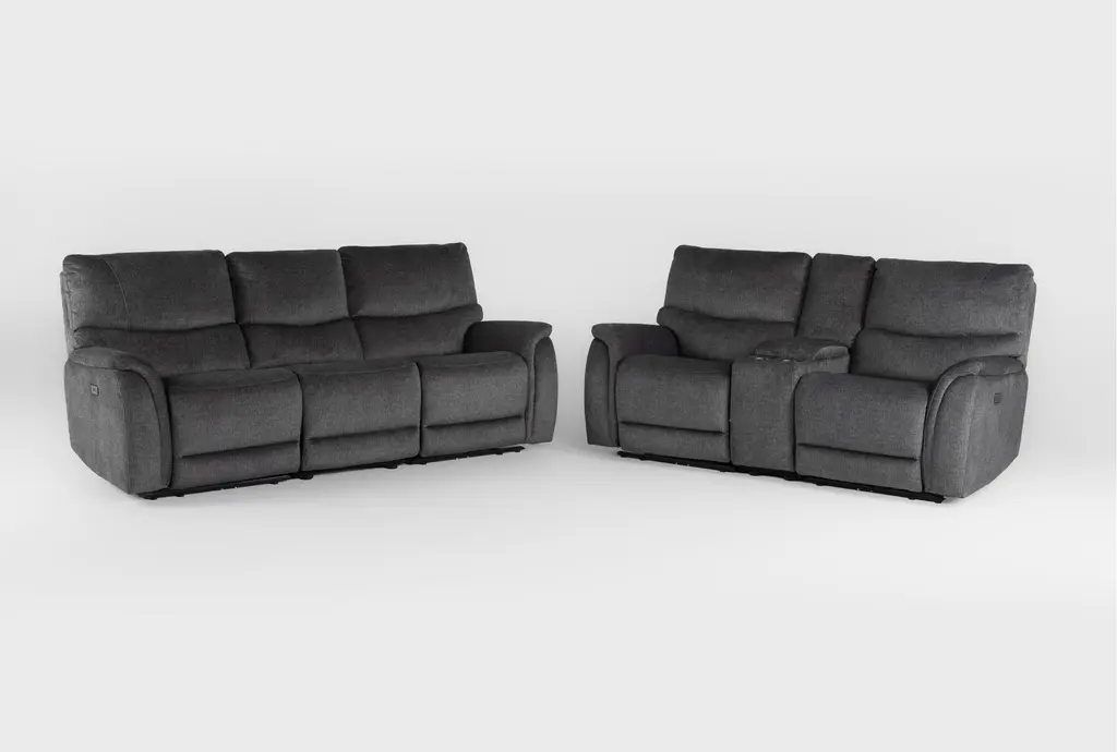 Experience unparalleled comfort and versatility with the Nash 6 Piece Power Reclining Modular Triple Recline Sofa and Console Loveseat Set. This casual sofa set in a sophisticated gunmetal color is designed to enhance your living room with its modular functionality and reclining features. Upholstered in 100% polyester fabric, this set provides durability and a soft touch for everyday relaxation.