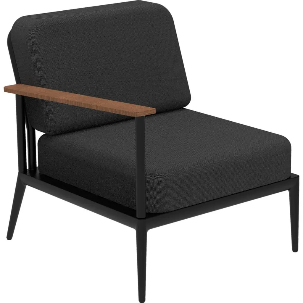 Nature black right modular sofa by MOWEEDimensions: D85 x W76 x H81 cm (seat height 42 cm).Material: Aluminum, upholstery and Iroko Wood.Weight: 19 kg.Also available in different colors and finishes.An unmistakable collection for its beauty and robustness. A tribute to the Valencian manufacturing tradition as a challenge to innovation, making it sustainable and durable. A fresher version, Nature. It presents touches of natural and sustainable wood, which gives warmth and comfort, and makes it a unique collection.Möwee is part of the work, effort and commitment of Gaviota, a leading company in the outdoor sector. It was set up as an independent venture to broaden horizons in the outdoor furniture world, with its own distinctive character and way of doing things. Freshness, simplicity, quality and design are at the heart of its DNA.