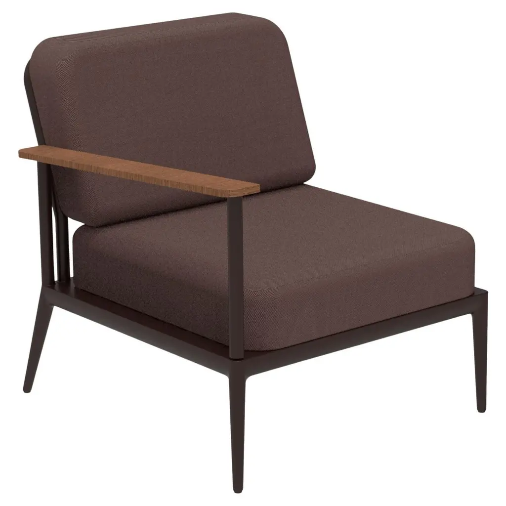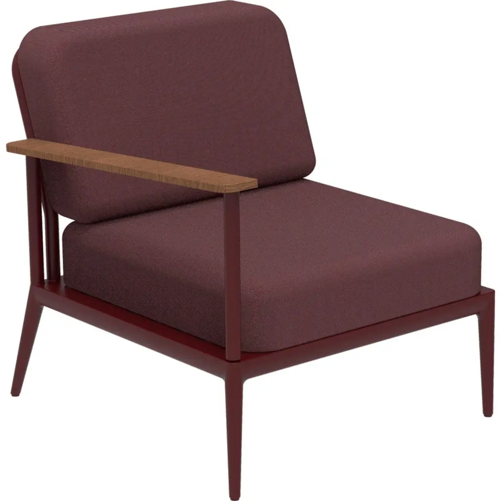 Nature Burgundy Right modular sofa by MOWEEDimensions: D85 x W76 x H81 cm (seat height 42 cm).Material: Aluminum, upholstery and Iroko Wood.Weight: 19 kg.Also available in different colors and finishes. An unmistakable collection for its beauty and robustness. A tribute to the Valencian manufacturing tradition as a challenge to innovation, making it sustainable and durable. A fresher version, Nature. It presents touches of natural and sustainable wood, which gives warmth and comfort, and makes it a unique collection.Möwee is part of the work, effort and commitment of Gaviota, a leading company in the outdoor sector. It was set up as an independent venture to broaden horizons in the outdoor furniture world, with its own distinctive character and way of doing things. Freshness, simplicity, quality and design are at the heart of its DNA.