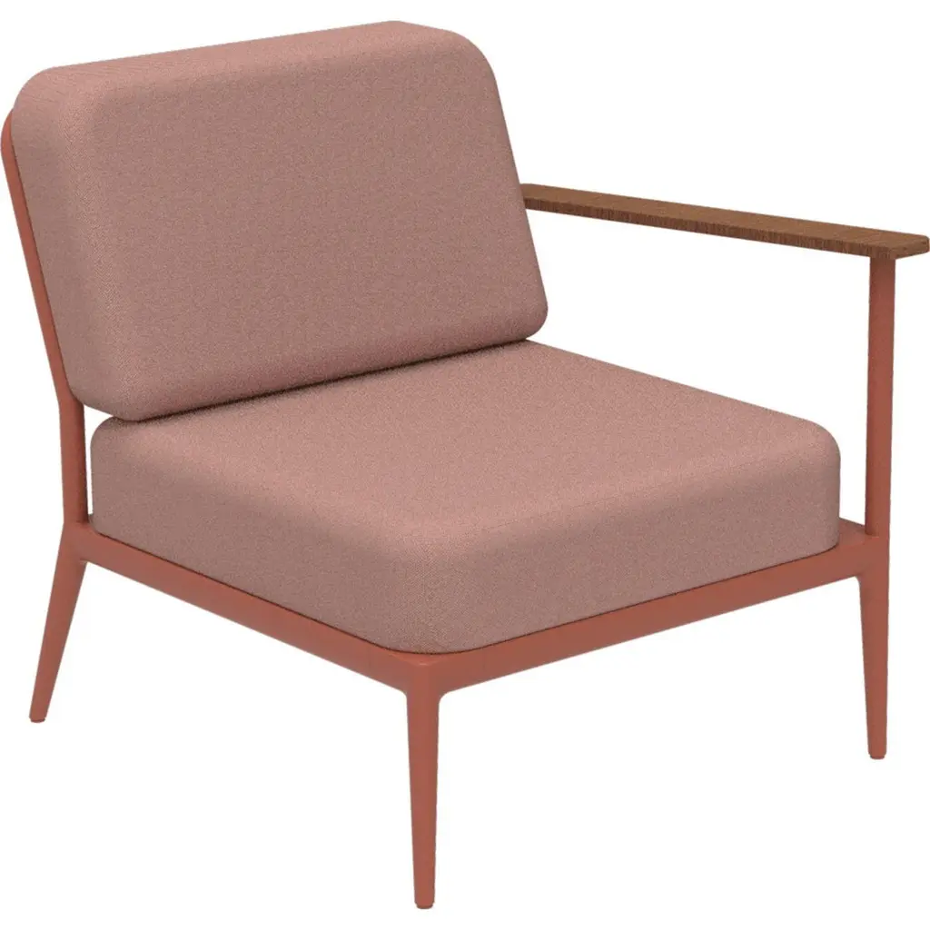 Nature Salmon left modular sofa by MOWEEDimensions: D85 x W76 x H81 cm (seat height 42 cm).Material: Aluminium, upholstery and Iroko Wood.Weight: 19 kg.Also available in different colors and finishes.An unmistakable collection for its beauty and robustness. A tribute to the Valencian manufacturing tradition as a challenge to innovation, making it sustainable and durable. A fresher version, Nature. It presents touches of natural and sustainable wood, which gives warmth and comfort, and makes it a unique collection.Möwee is part of the work, effort and commitment of Gaviota, a leading company in the outdoor sector. It was set up as an independent venture to broaden horizons in the outdoor furniture world, with its own distinctive character and way of doing things. Freshness, simplicity, quality and design are at the heart of its DNA.