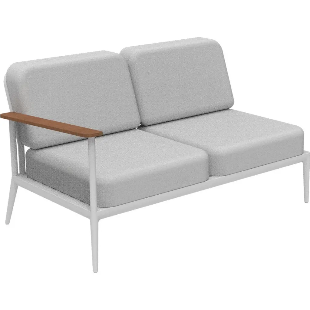 Nature White Double Right modular sofa by MOWEEDimensions: D85 x W144 x H81 cm (seat height 42 cm).Material: Aluminum, upholstery and Iroko Wood.Weight: 29 kg.Also available in different colors and finishes.An unmistakable collection for its beauty and robustness. A tribute to the Valencian manufacturing tradition as a Challenge to innovation, making it sustainable and durable. A fresher version, Nature. It presents touches of natural and sustainable wood, which gives warmth and comfort, and makes it a unique collection.Möwee is part of the work, effort and commitment of Gaviota, a leading company in the outdoor sector. It was set up as an independent venture to broaden horizons in the outdoor furniture world, with its own distinctive character and way of doing things. Freshness, simplicity, quality and design are at the heart of its DNA.