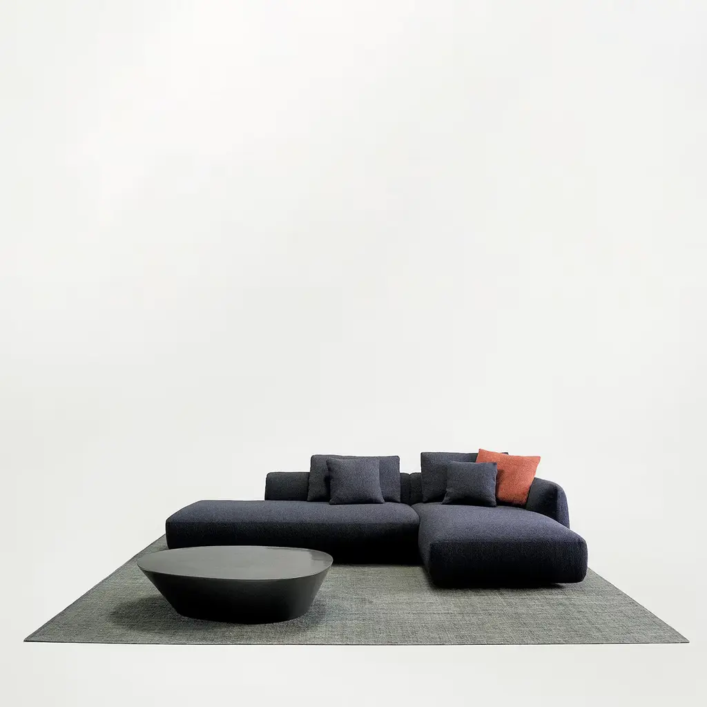 Enveloped in fine boucle blue fabric (ref. cat. C Barnum/19), this elegant sofa offers a dynamic study between comfort and simplicity. The generosity of its inner padding outlines plump volumes promising long-lasting comfort, a welcoming appeal further emphasized by the chaise-tongue module this modular version comprises. Perfect for adding depth to light-toned modern decors. Decorative cushions are included.