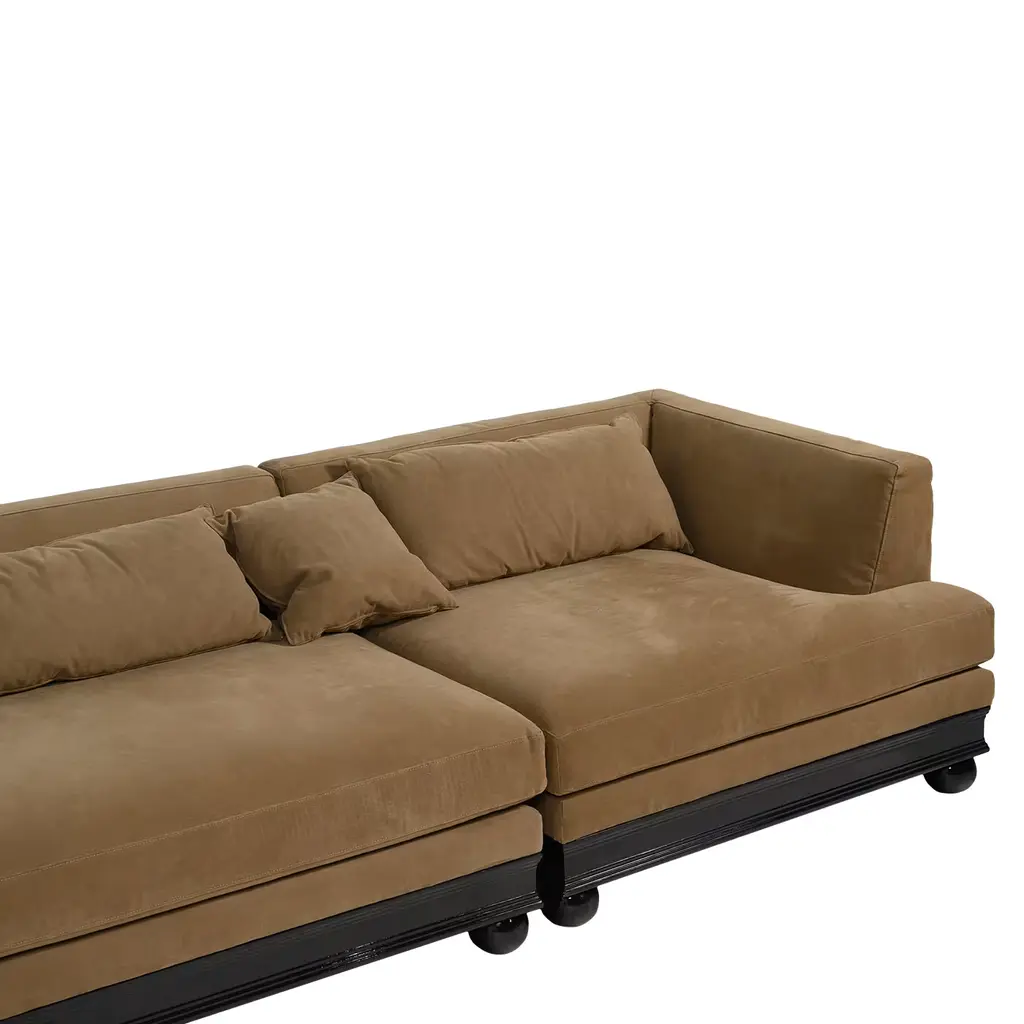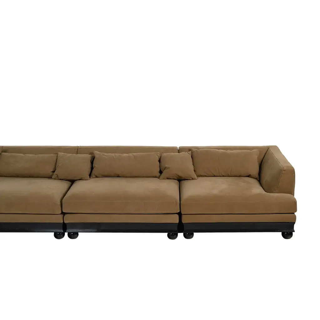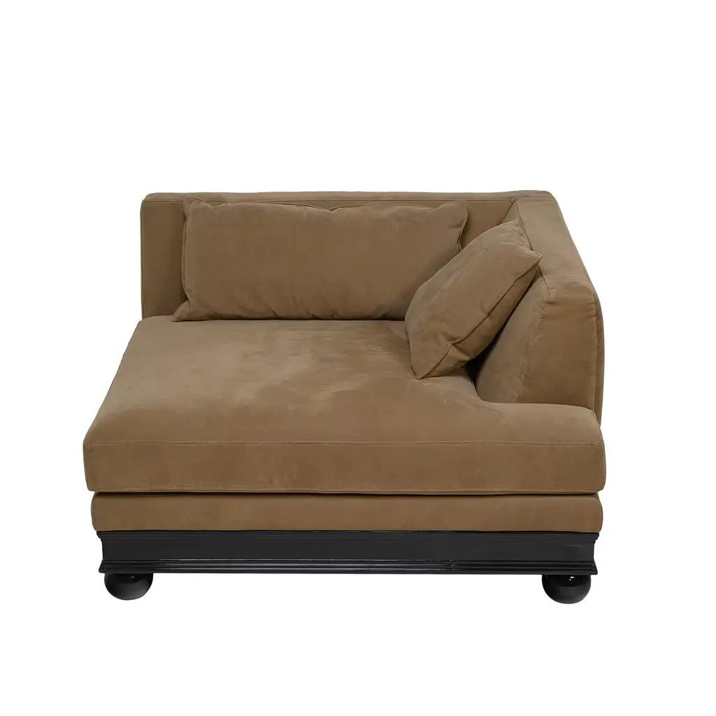 Designed as part of a wider modular composition available in the Artemest catalog, this armchair will transform otherwise bare corners into small islands of pure comfort. The generous inner padding complementing the wooden shell is sealed by a soft and fresh cotton upholstery, its brown tone well harmonizing with the black lacquer finishing the classic-inspired frame. Decorative cushions are included.