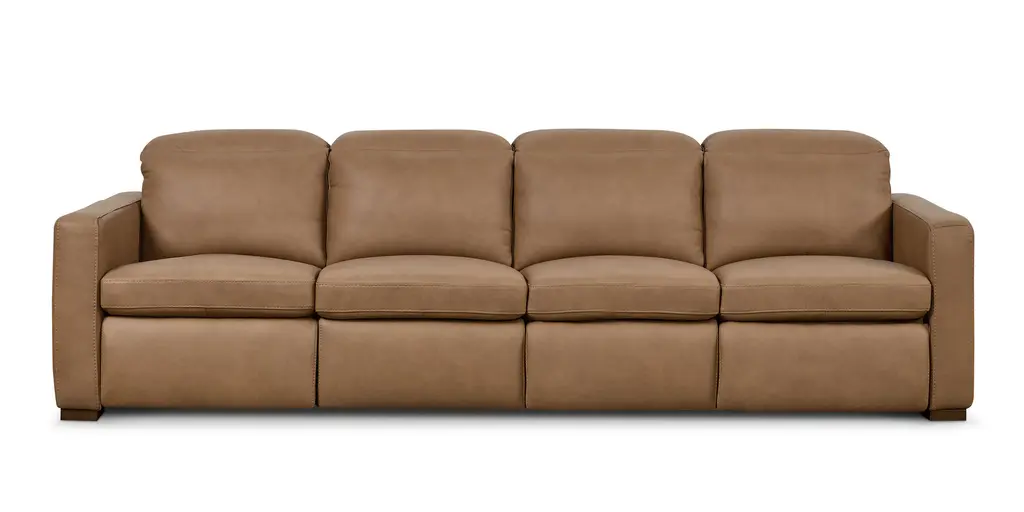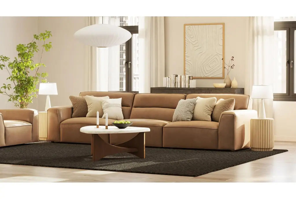 Introducing the Rhone 129" Light Brown Leather 3 Piece Modular Sofa, a perfect addition to your modern living room. This sofa blends contemporary design with exceptional comfort, making it ideal for family gatherings or relaxing evenings at home. Its modular design allows you to customize the layout to fit your space, while the light brown leather adds a touch of warmth and sophistication.