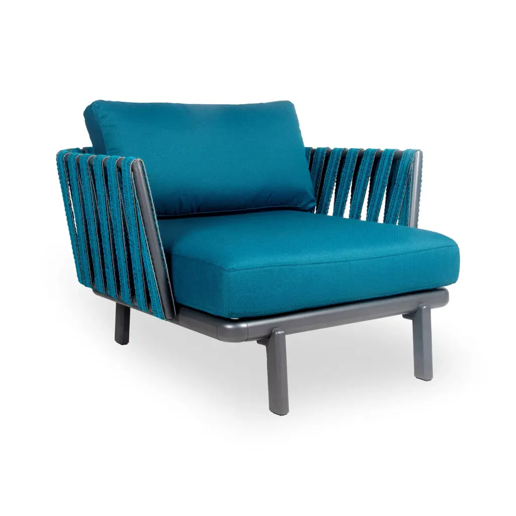 Ribbons Navy Right Modular sofa by MOWEEDimensions: D83 x W80 x H81 cm (seat height 42 cm)Material: Aluminum and upholsteryWeight: 19 kgAlso available in different colors and finishes. An unmistakable collection for its beauty and robustness. A tribute to the Valencian manufacturing tradition as a challenge to innovation, making it sustainable and durable. A collection with details that make it unique. We discover its most representative side, Ribbons. Engineering and tradition come together, thus achieving a collection with its own character.Möwee is part of the work, effort and commitment of Gaviota, a leading company in the outdoor sector. It was set up as an independent venture to broaden horizons in the outdoor furniture world, with its own distinctive character and way of doing things. Freshness, simplicity, quality and design are at the heart of its DNA.