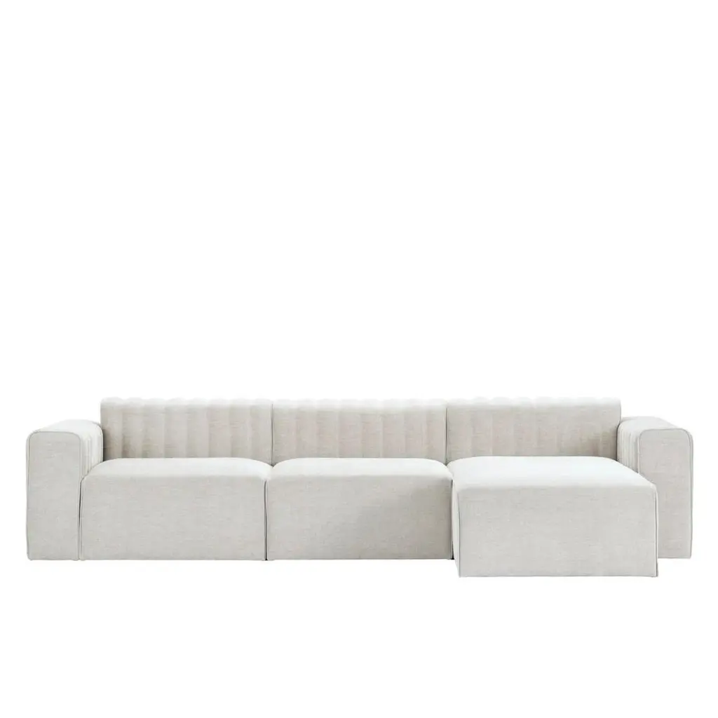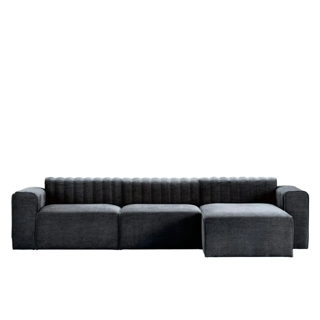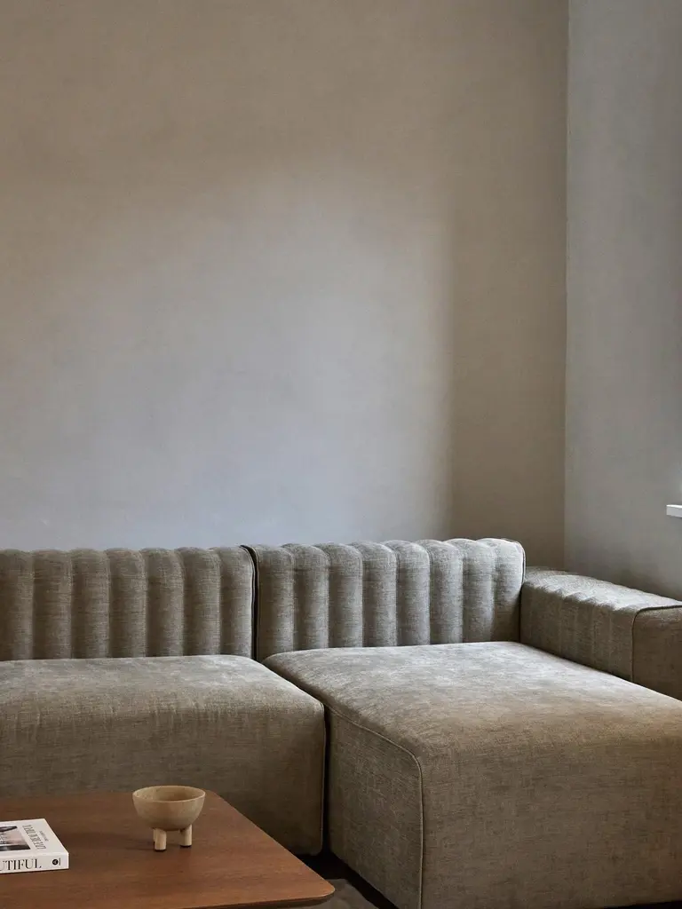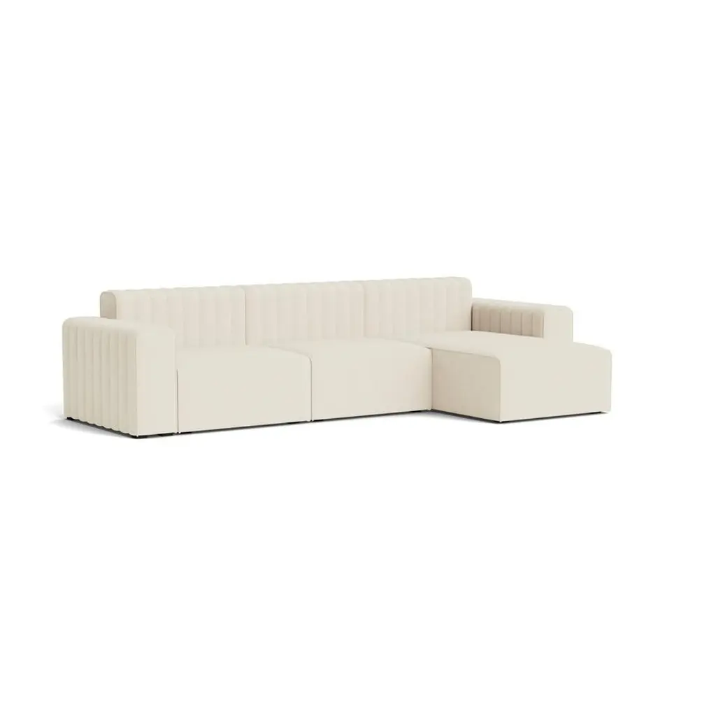 Riff sofa by Kristian Sofus Hansen & Tommy Hyldahl for Nor11Setup presented: ( 1 x right arm / 1 x center / 1 x chaise lounge):Dimensions : W. 290 cm / D. 152 cm / H. 70 cm / Seating H. 40.5 cmFabric: Nina Linen Col. 02 Modular sofa: assemble different modules to create your compositionWide range of fabrics and colorsCAT 1: Cura, Velvet, Nina, Fame, RemixCAT 2: Barnum, Breeze Fusion, Savoy, Canvas, UltraCAT 3: Fiord, Hallingdal, Savanna, Zero, Steelcut Trio, Moss, SafireNORR11 is a Danish design brand driven by a vision to bring new perspectives to modern interiors across furniture and lightings. Crafted with honest and natural materials the designs are built-to-last and with commitment to sustainability.The Riff Sofa is a study on the classic modular sofa, elaborating on the simple boxy modules. The fluted upholstery adds a certain rhythm to the minimalist sofa modules and turns the modular sofa into a refined piece of furniture. Each module has refined piping that gives an elegant detail. The word Riff comes from the world of jazz music and means “to borrow and elaborate on”