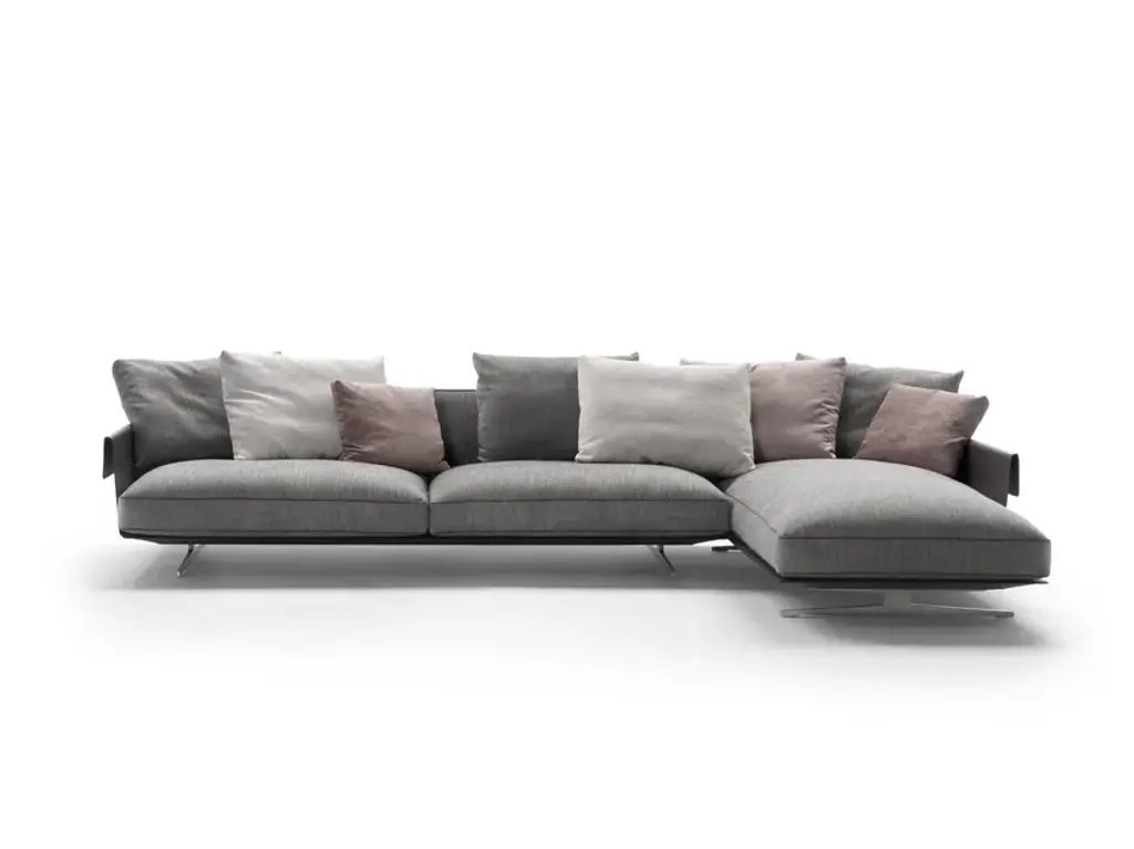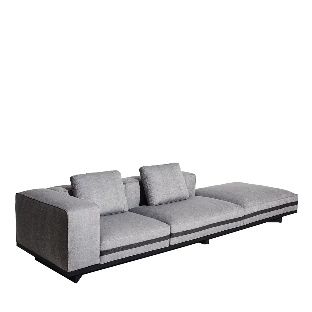 Proportions speaking to clean-lined modernism distinguish the elegant design of this modular three-seater sofa. Featuring ultra-plush cushions that invite relaxation, its modular components wrapped in brown fabric (M163/10 cat. A) include an open seat as the terminal that lends a versatile and welcoming look to its otherwise restrained design. Decorative cushions are included.