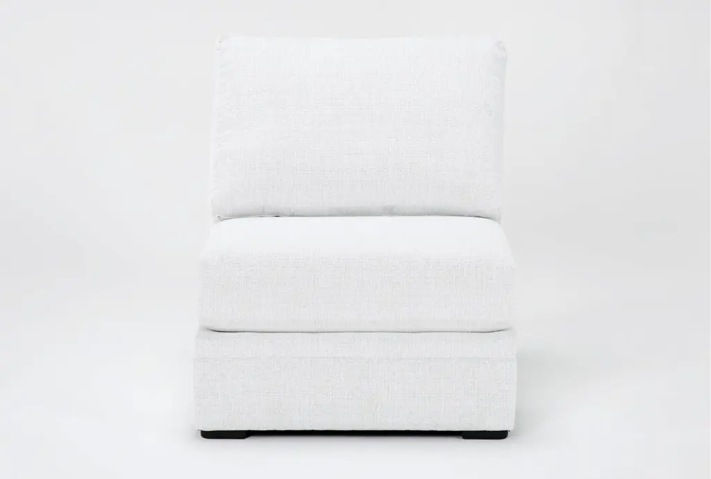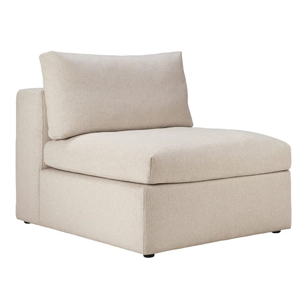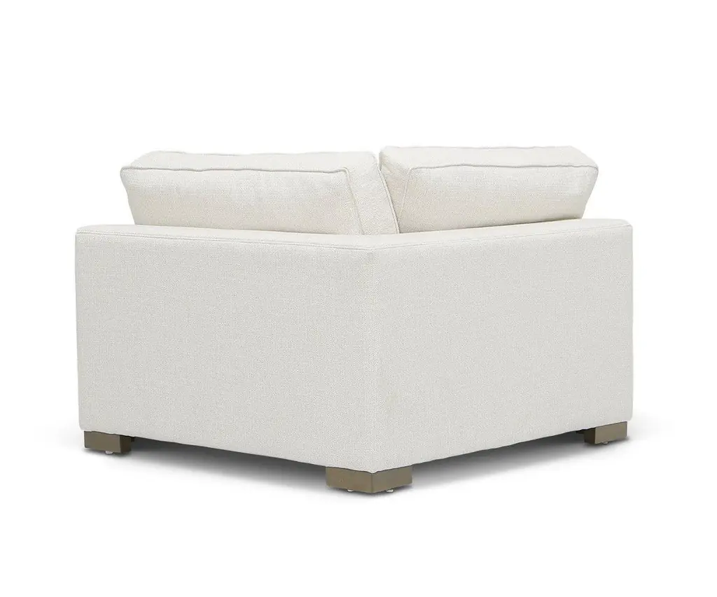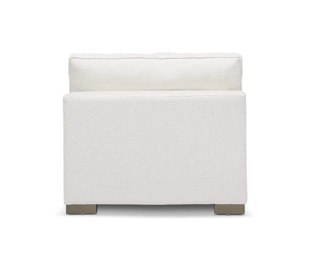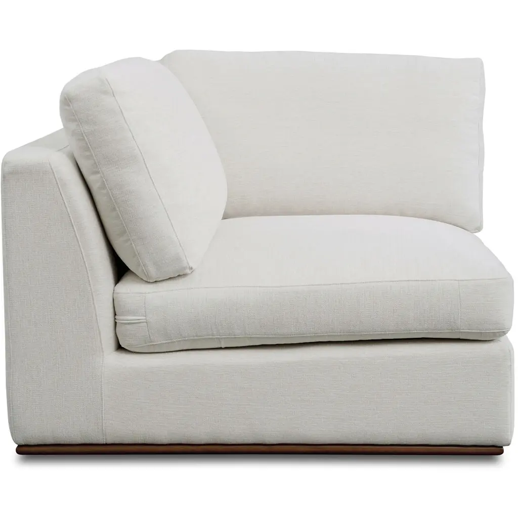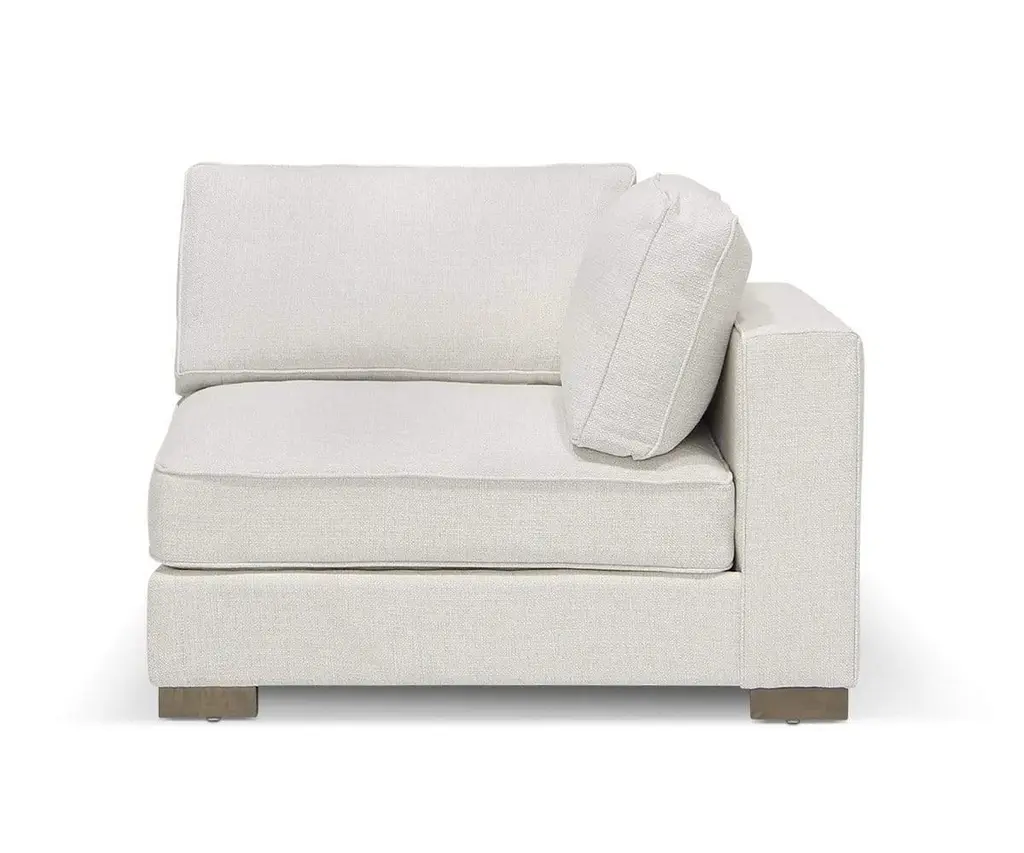 The Roanne Modular Sofa provides comfortable seating for the entire family. The approachable modular design provides flexibility and can be configured in many ways, within any space. The clean modern lines blend with any decor style while plush feather blend cushions and deep seats maximize the feelings of restorative leisure. Kick up your feet on the ottoman, which can be moved to either side of the sectional for even more flexibility. The off-white fabric upholstery is durable yet soft, and contrasts nicely with wood block feet. Made in the USA.