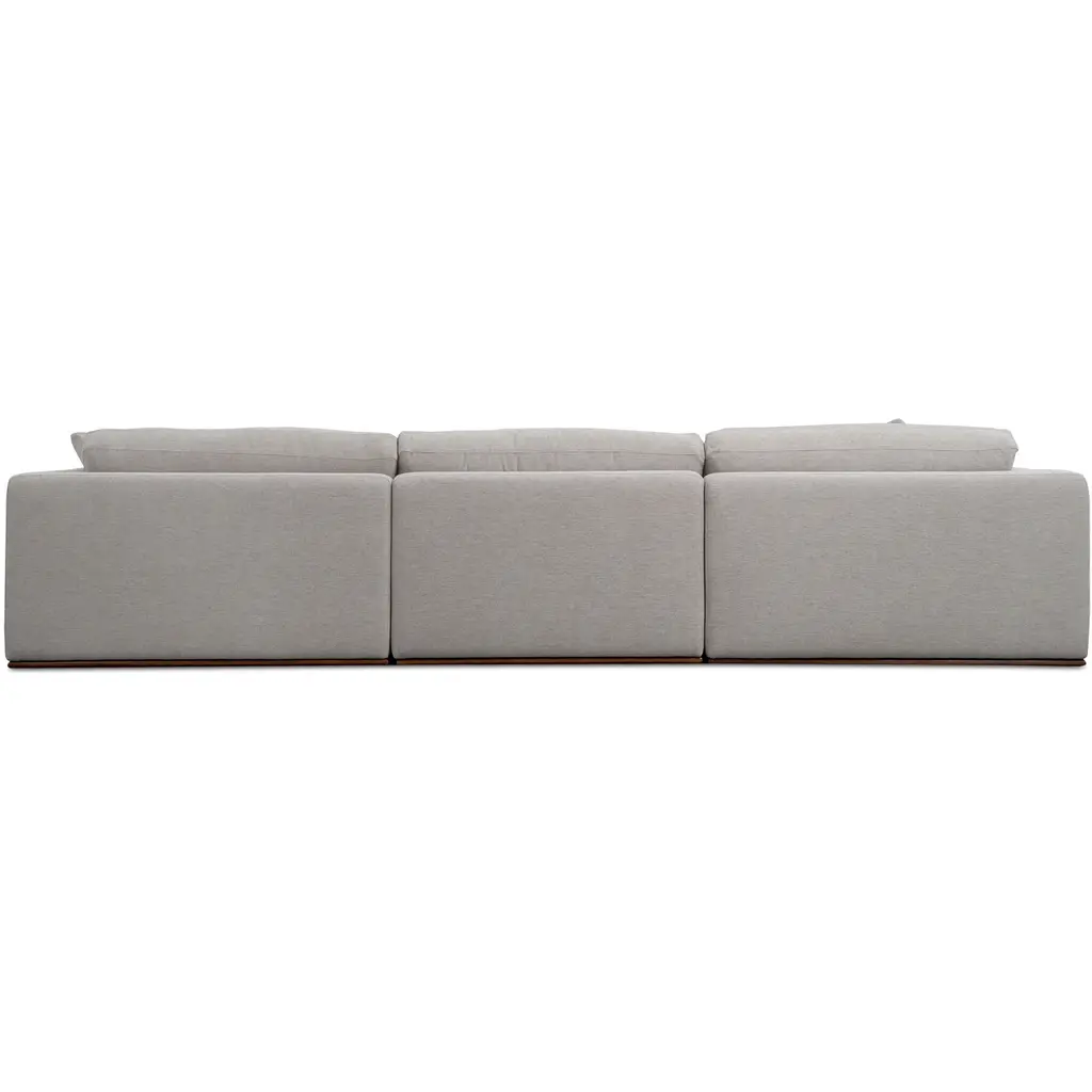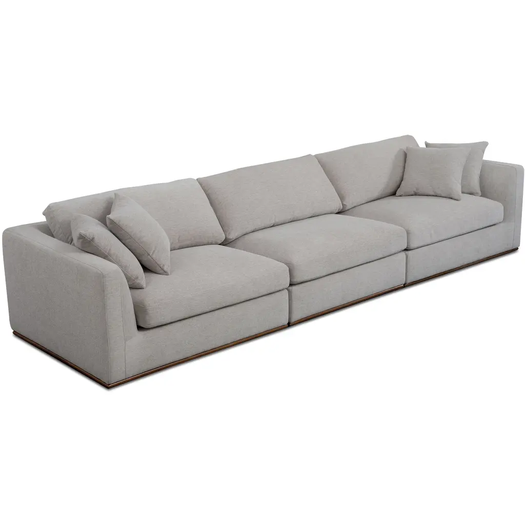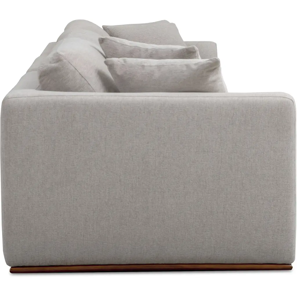 The Rue modular sectional features a generous 70% feather-fill topper within its seating, accompanied by toss cushions for an added layer of coziness. Its elegant silhouette is highlighted by a rubber wood base, creating a sleek floating appearance, all supported by subtle wooden legs. Designed with extreme comfort in mind, this modular embodies easy, neutral styling.