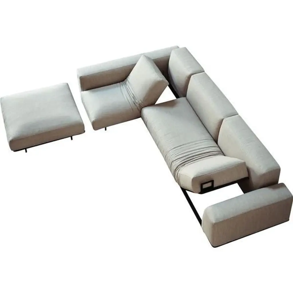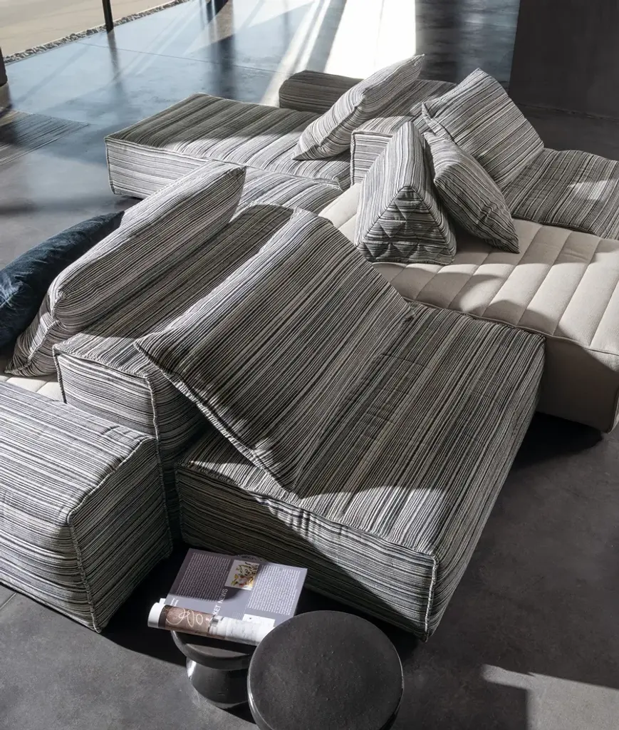 Samet G is a 6-seater, double-sided composition of the Samet sofa, equipped with a chaise longue.Samet is a modular sofa upholstered in polyurethanefoam, removable cover. Attention: With KINGSMAN and CORDUROY fabrics, the direction of the stripes runs perpendicular to the quilting. With QUILT MALTA, QUILT VELOUR and 3D fabric, there is no quilting. 3D fabric also provides only inner seam.The Samet modular sofa has no rules, it is a multifunctional and configurable product that places the person as an active subject in the composition of their own space, encouraging them to experiment with new forms of use. Cosy and hospitable seats are juxtaposed with each other in regular and soft geometries, a dynamic design to create multiple types of more or less informal seating. Details, stitching and matelassé enrich a simple modularity that creates infinite compositions with a timeless aesthetic, from the most classic sofa to the most multifaceted, from the tidiest to the most disjointed.
