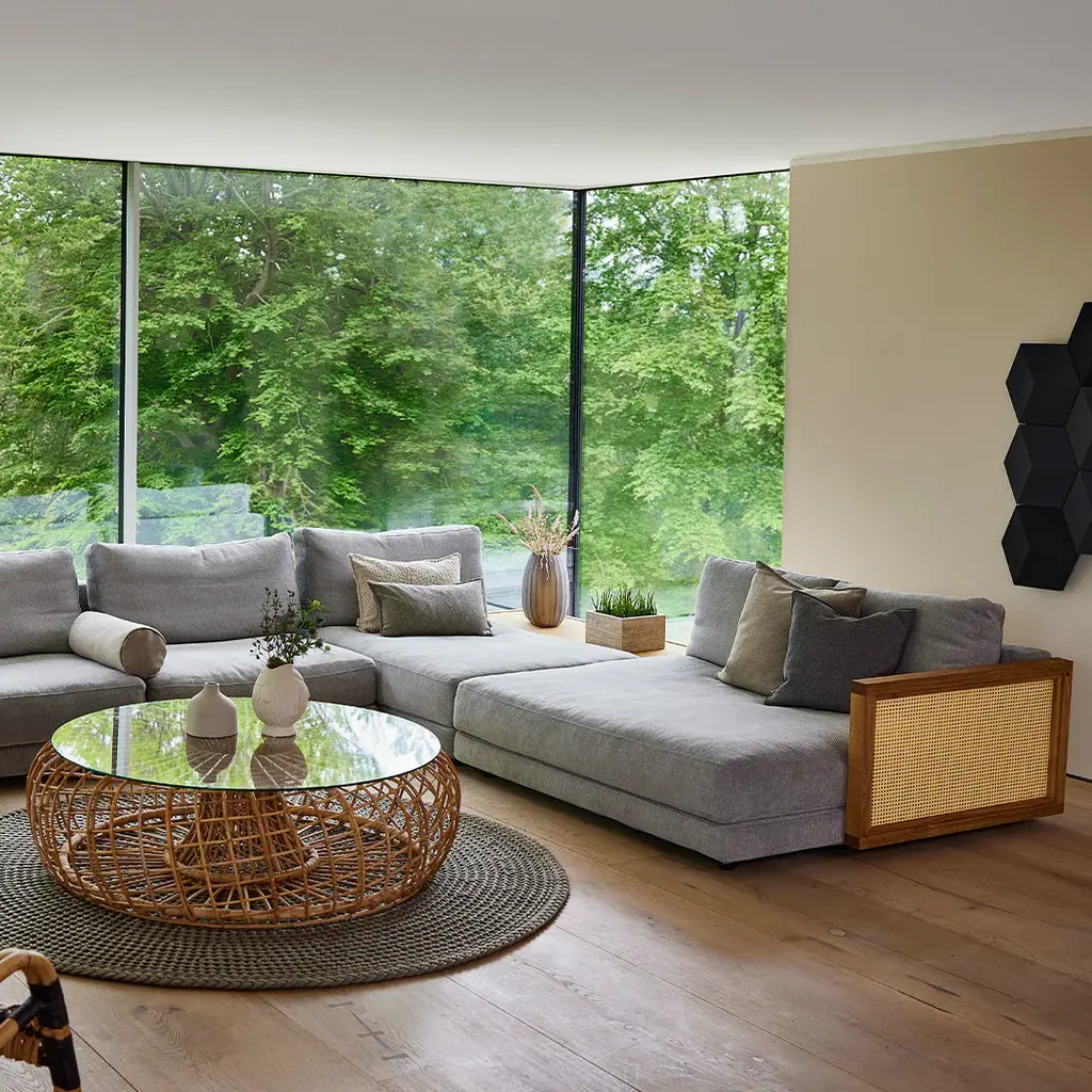 Components for Scale Modular Sofa . Scale is a soft and relaxed sofa in a Scandinavian cozy design. The sofa combines a soft, ample form with outstanding materials in a well-proportioned design. Scale has a low seating height and deep seats which create room for unwinding with your loved ones. By combining the different elements within the series, you can change the appearance and functions of the sofa to your comfort. The upholstery in Cane-line fabric is soft and comfortable. Scale has a boxy look with significant armrests which is softened by the fluffy cushions with down filling for ultimate comfort.