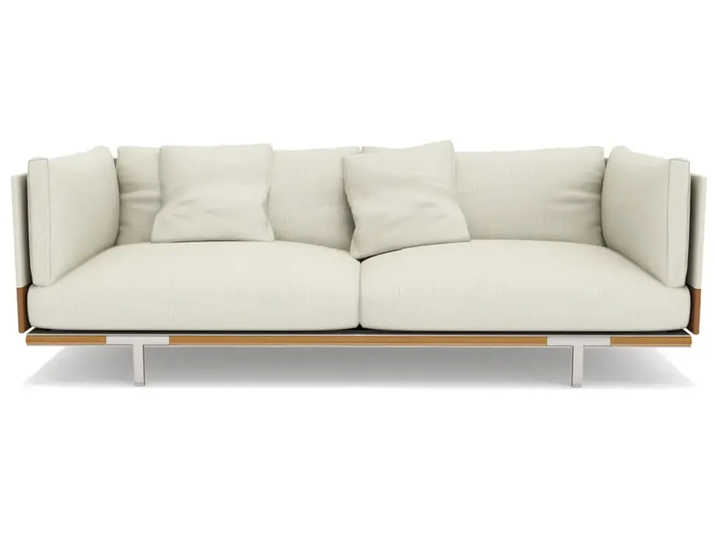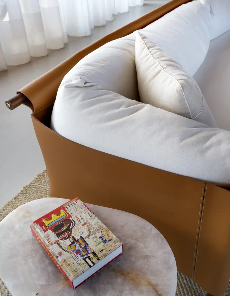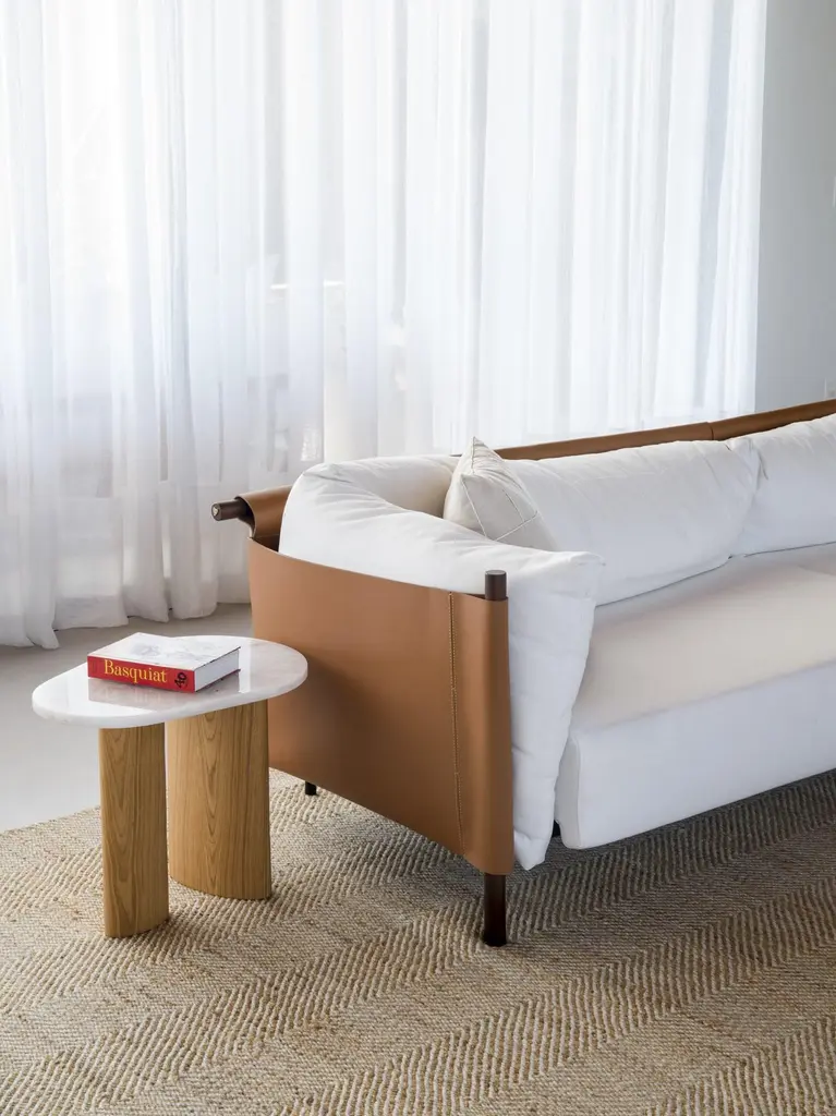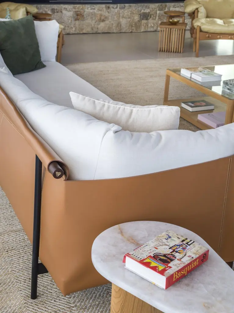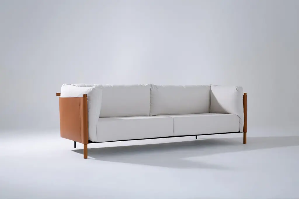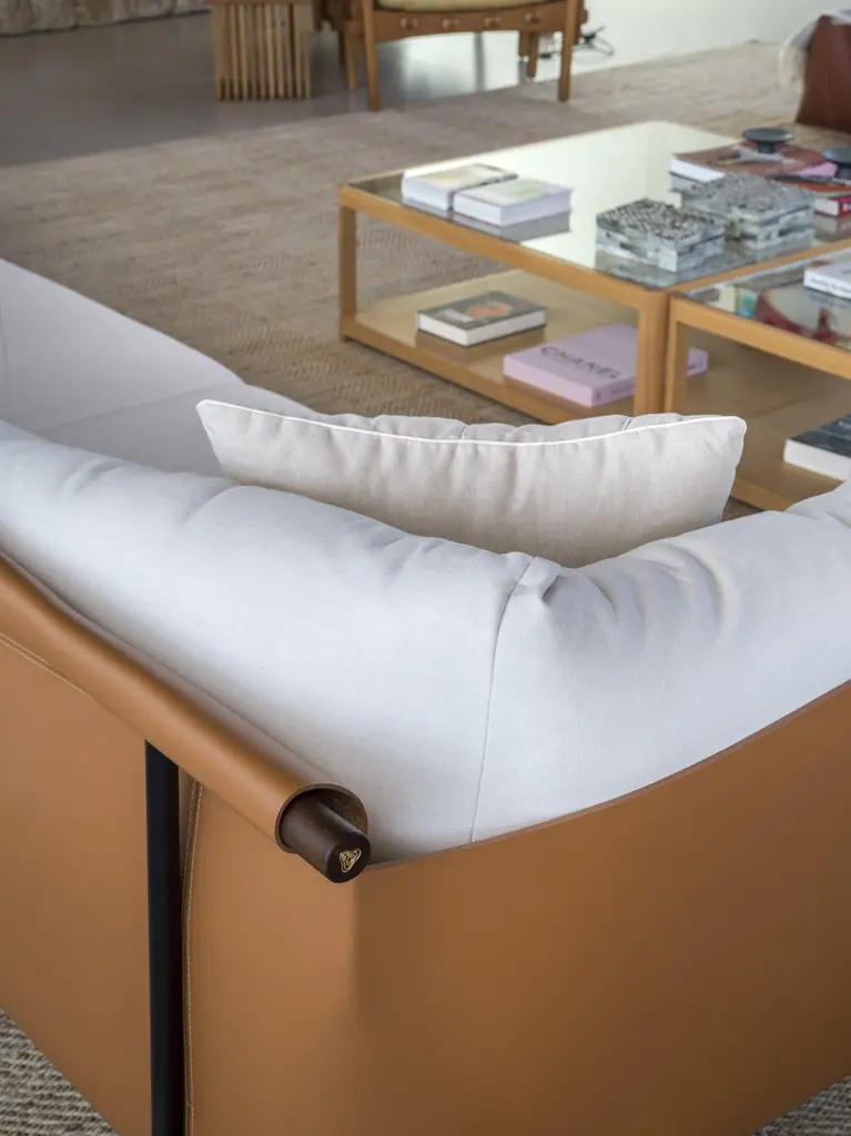 The Sela sofa, designed by Ilse Lang from Studio Faro for +55design, blends minimalist structure with intelligent modularity. Its slim steel frame and lateral supports create a lightweight yet durable foundation, while the vegetable-tanned leather backrest introduces a rich, tactile element that softens the industrial aesthetic. Compact in footprint yet generous in comfort, the Sela sofa is composed of interlocking segments—allowing it to scale easily into larger configurations without logistical limitations, making it ideal for both residential and contract settings. Removable fabric seat and back cushions ensure easy cleaning and maintenance, adding functionality to its elegant form. Purposefully designed for adaptability and longevity, the Sela sofa reflects Lang’s commitment to essential design—where material integrity and thoughtful engineering meet timeless, understated beauty.