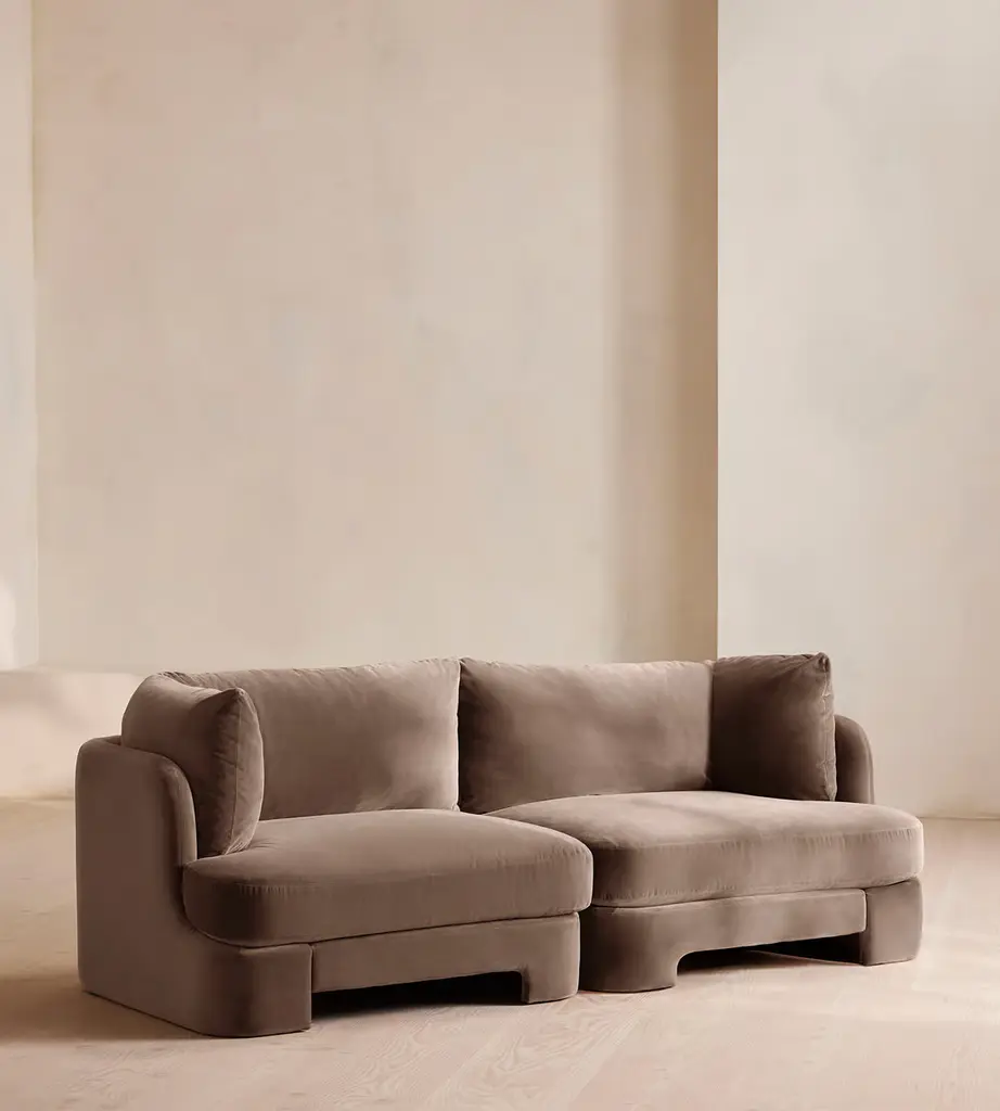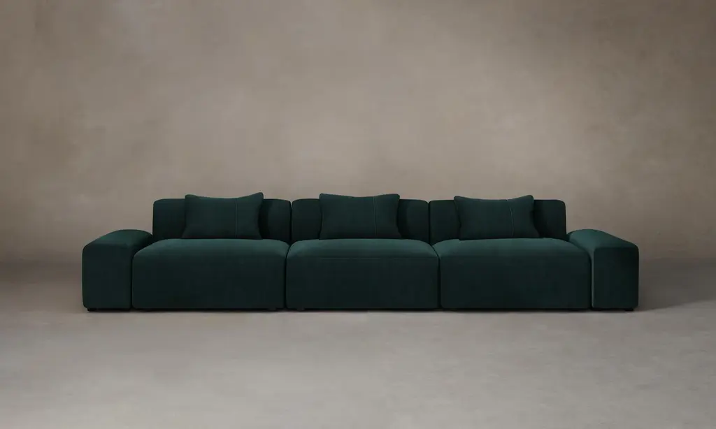 An extraordinary contemporary design that merges ergonomic and aesthetic qualities, this modular sofa is comprised of a corner module, a central one, and a side chaise longue. Softly padded with multi-density foam, it is upholstered with green fabric. Customizable, modules from this design can be combined upon request, please consult the Concierge for further details. Decorative cushions are not included.