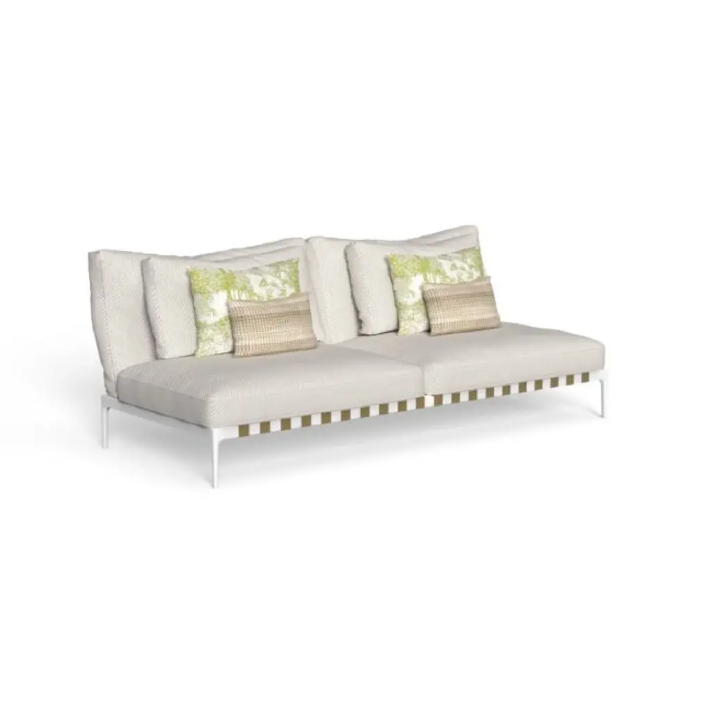The modular sofa from the Salinas collection gives charm and refinement to the outdoor environment. Thanks to the predominant textile component, it offers continuity between indoor and outdoor. The natural colors of the various elements of the sofa, make up a color range inspired by the region of Salinas, Ibiza. The soft design of the cushions combined with metal details, give rise to a striking composition that expresses timeless elegance.