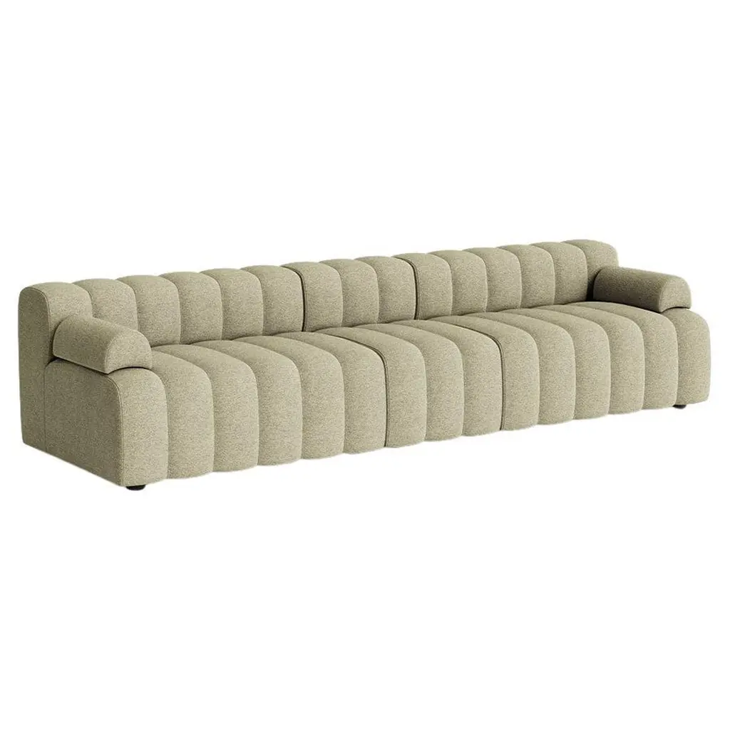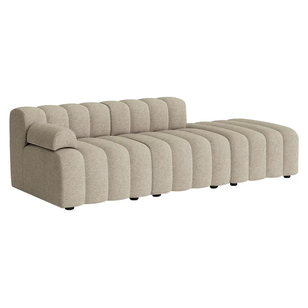 Inspired by the bold aesthetics of the 1970s, the Studio Modular Sofa from Nor11 is characterized by its fluted upholstery and soft, inviting lines. The system includes multiple module variations that can be arranged to form different setups, whether for small living areas or larger social spaces. The loose armrest cushions are movable yet dense, boasting ample customization without sacrificing a comfortable and sturdy seat. Modules can be linked using a click-link system and are available in a wide range of high-quality fabrics and leather options.