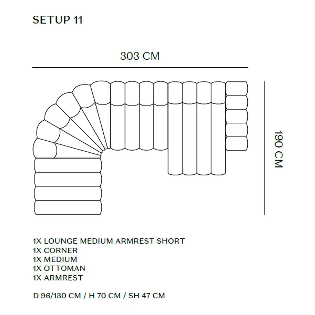 Studio is defined by its bold fluted upholstery characteristics inspired by late 70s sofa styles, refined in a contemporary way, giving the series a unique identity. Featuring a versatile yet simple system of modules, Studio offers a variety of options to form numerous settings, shapes, and styles, seamlessly blending into all sorts of environments. With a 360-degree finish, each module can be a stand-alone piece or reversed to create a two-sided sofa. The movable armrest cushion adds convenience and adaptability and the soft foam mix ensures ultimate comfort. To create a cohesive expression and accommodate diverse interior needs, the collection also upholds a bench and pouf. Setup Includes: [1] Ottoman [1] Lounge Medium w/ Short Left Armrest [1] Corner [1] Medium Center [1] Armrest