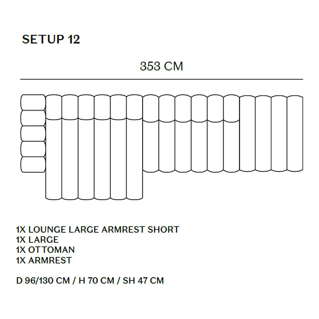 Studio is defined by its bold fluted upholstery characteristics inspired by late 70s sofa styles, refined in a contemporary way, giving the series a unique identity. Featuring a versatile yet simple system of modules, Studio offers a variety of options to form numerous settings, shapes, and styles, seamlessly blending into all sorts of environments. With a 360-degree finish, each module can be a stand-alone piece or reversed to create a two-sided sofa. The movable armrest cushion adds convenience and adaptability and the soft foam mix ensures ultimate comfort. To create a cohesive expression and accommodate diverse interior needs, the collection also upholds a bench and pouf. Setup Includes: [1] Ottoman [1] Large Center [1] Large Lounge w/ Short Right Armrest [1] Armrest