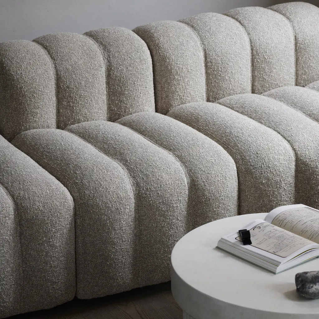 Introducing Studio, the newest sofa landscape in the NORR11 collection - a tribute to the timeless era of the 70s and its expressive aesthetics. Featuring a versatile yet simple system of modules, appearing in limitless options to form numerous settings, shapes and styles, blending into all sort of environments. Whether a small living setting or a spacious public site. Studio is defined by its bold fluted upholstery characteristics inspired by late 70s sofa styles, refined in a contemporary way - giving the series a unique identity. Each module of Studio articulates soft and welcoming lines ideally suited for living, socialising and relaxing where one can feel totally at ease. The armrest cushion is loose and can be moved and repositioned across the series, balancing the fluted upholstery. Setup Includes: [2] Large Center [1] Small Center [2] Armrest