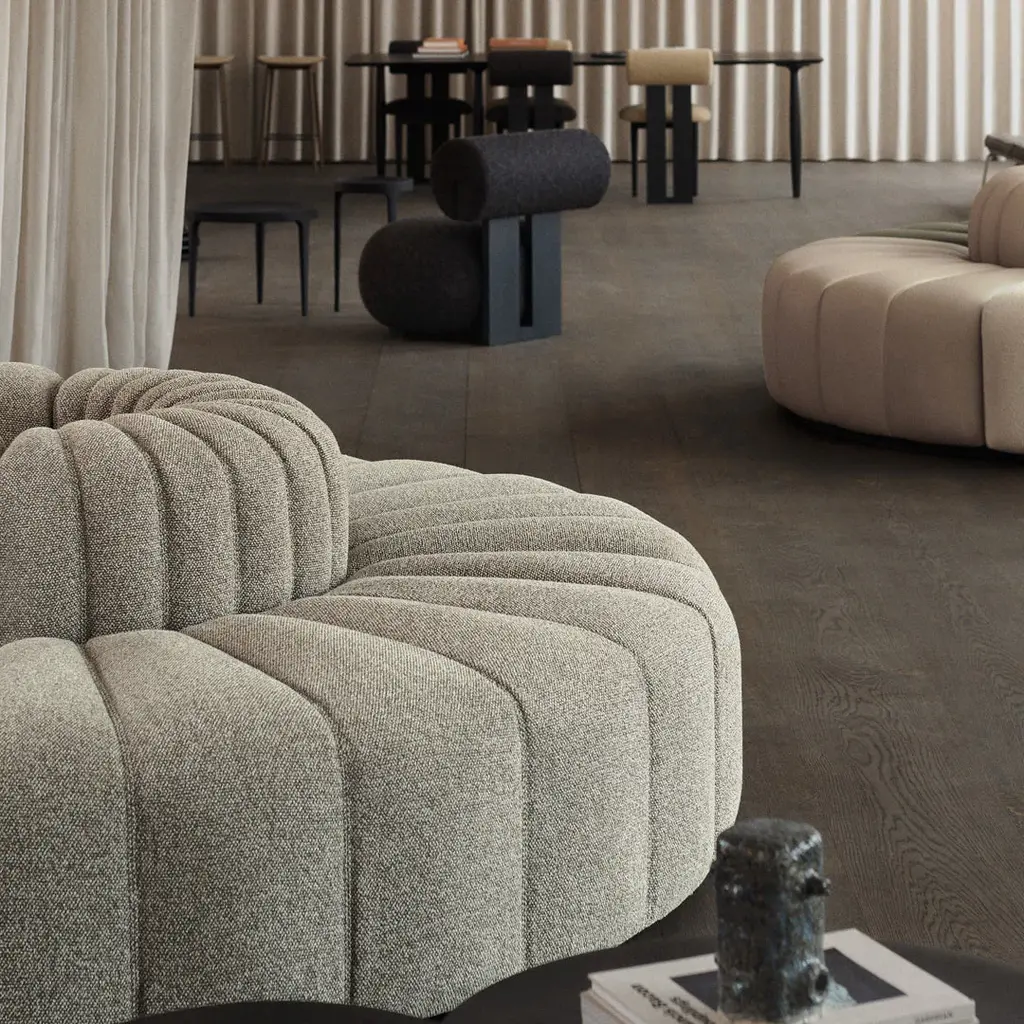 Introducing Studio, the newest sofa landscape in the NORR11 collection - a tribute to the timeless era of the 70s and its expressive aesthetics. Featuring a versatile yet simple system of modules, appearing in limitless options to form numerous settings, shapes and styles, blending into all sort of environments. Whether a small living setting or a spacious public site. Studio is defined by its bold fluted upholstery characteristics inspired by late 70s sofa styles, refined in a contemporary way - giving the series a unique identity. Each module of Studio articulates soft and welcoming lines ideally suited for living, socialising and relaxing where one can feel totally at ease. The armrest cushion is loose and can be moved and repositioned across the series, balancing the fluted upholstery. Setup Includes: [4] Curve