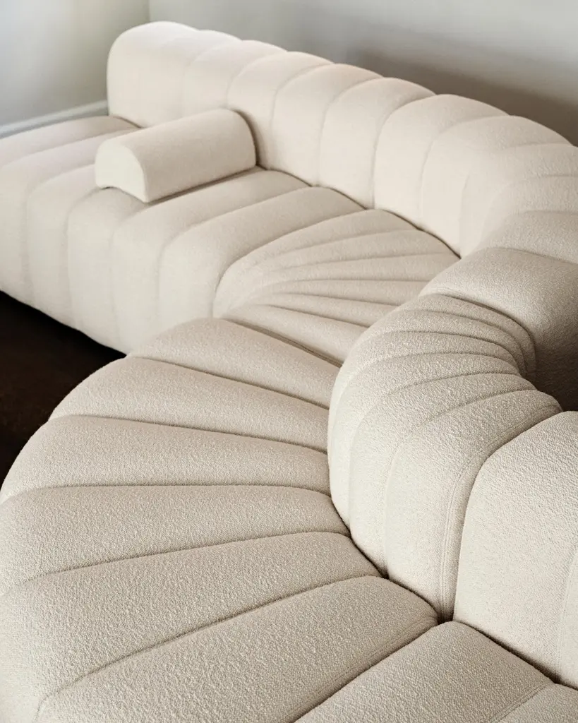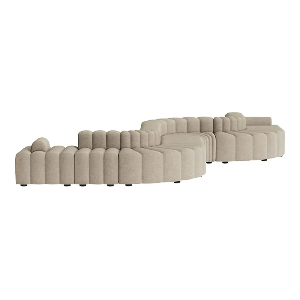 Studio sofa by Kristian Sofus Hansen & Tommy Hyldahl for Nor11.Measures: Setup 8 modules : 1 large, 1 medium, 1 small, 2 curve, 1 corner, 1 ottoman, 2 armrest) W. 406 cm / D. 400 cm / H. 70cm / Seating H. 42cm.Model shown: Barnum bouclé 24Modular sofa: Assemble different modules to create your composition.Wide range of fabrics and colorsCAT 1: FameCAT 2: Barnum, Breeze Fusion, SavoyCAT 3: Fiord, Hallingdal, Savanna, Zero, Steelcut Trio, Moss, SafireCAT 4: BaruCAT 5: Dunes, Spectrum / Noir.Introducing Studio, the newest sofa landscape in the NORR11 collection - a tribute to a timeless era of the 70s and its expressive aesthetics. Featuring a versatile but simple system of modules, appearing in limitless options to form numerous settings, shapes and styles to adhere to all types of environments. Whether for a small living setting or spacious public site.Studio is defined by its bold fluted upholstery characteristics inspired by late 70s sofa styles, refined in a contemporary way - giving the series a unique identity. Each module of Studio articulates soft and welcoming lines ideally suited for living, socialising and relaxing where one can feel totally at ease. The armrest cushion is loose and can be moved and repositioned across the series, balancing the fluted upholstery.
