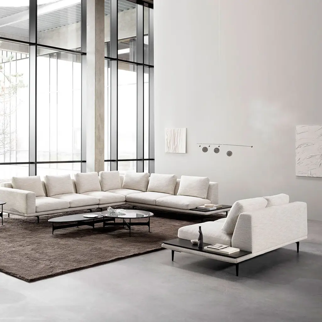 Designed with complementary trays in black stained oak, the Surface Sofa prompts a new take on modularity with engaging levels and dimensions that speak volumes in any spatial context. Thin legs in black powder-coated aluminium add the finishing touches, making the modules soar gracefully above the ground.