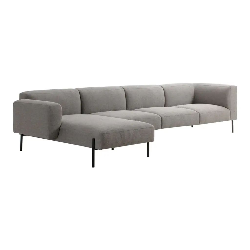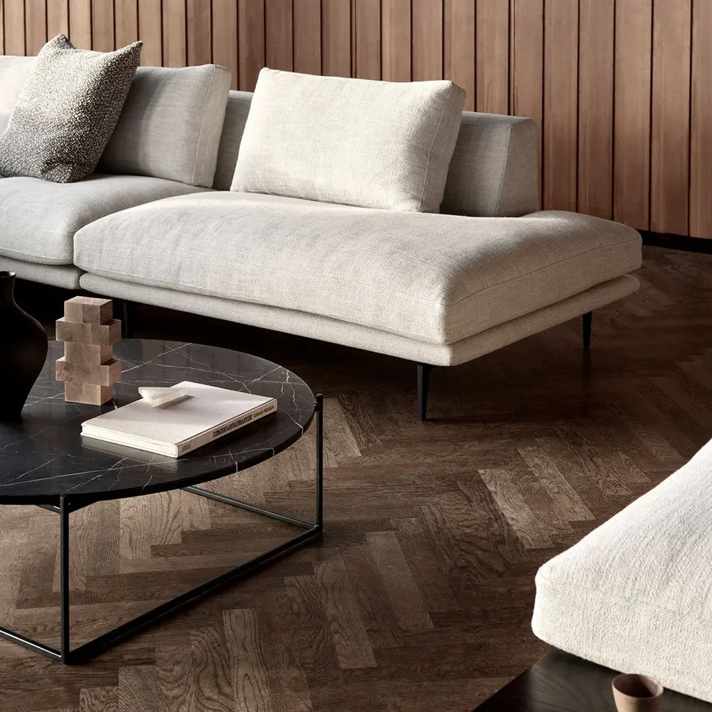 Designed with complementary trays in black stained oak, the Surface Sofa prompts a new take on modularity with engaging levels and dimensions that speak volumes in any spatial context. Thin legs in black powder-coated aluminium add the finishing touches, making the modules soar gracefully above the ground.