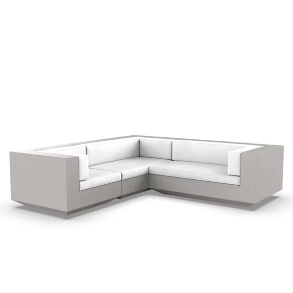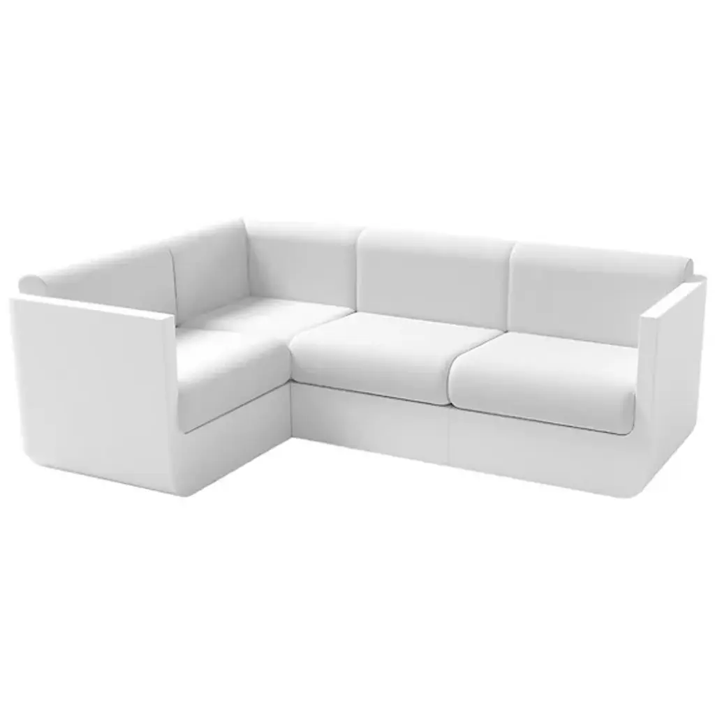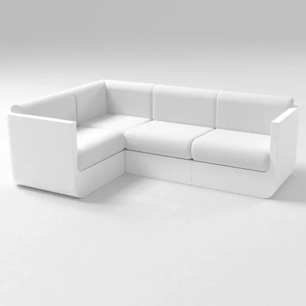 This Ulm 4 Seater Outdoor Modular Sofa by Vondom is the perfect combination of modern design and ergonomics. Its rigid structure and resilient support provide total comfort, while its contemporary and unique style pays tribute to the formal approach of the Ulm School. This sofa is made of rotational molded resin, linear low-density polyethylene, and soft acrylic outdoor fabric. It has a comfortable leather-like texture, making this sofa ideal for indoor and outdoor use.