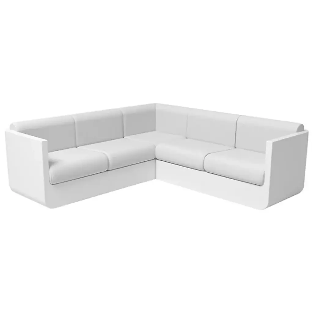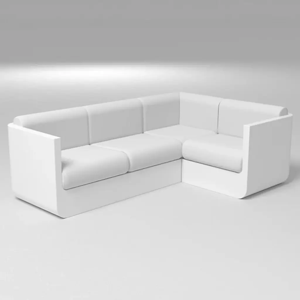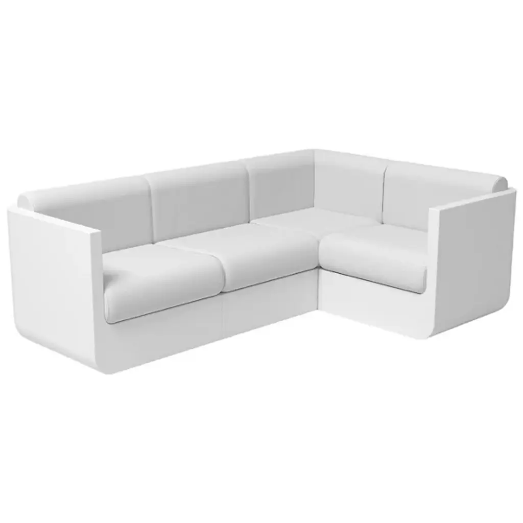 This Ulm 4 Seater Outdoor Modular Sofa by Vondom is the perfect combination of modern design and ergonomics. Its rigid structure and resilient support provide total comfort, while its contemporary and unique style pays tribute to the formal approach of the Ulm School. This sofa is made of rotational molded resin, linear low-density polyethylene, and soft acrylic outdoor fabric. It has a comfortable leather-like texture, making this sofa ideal for indoor and outdoor use.