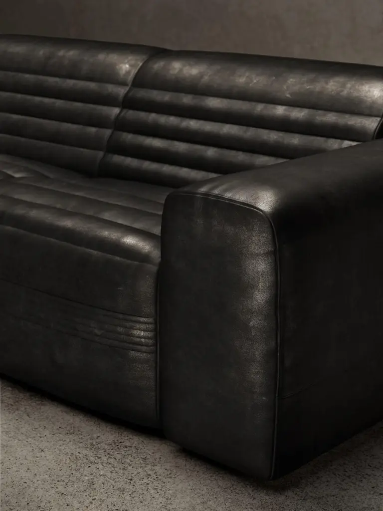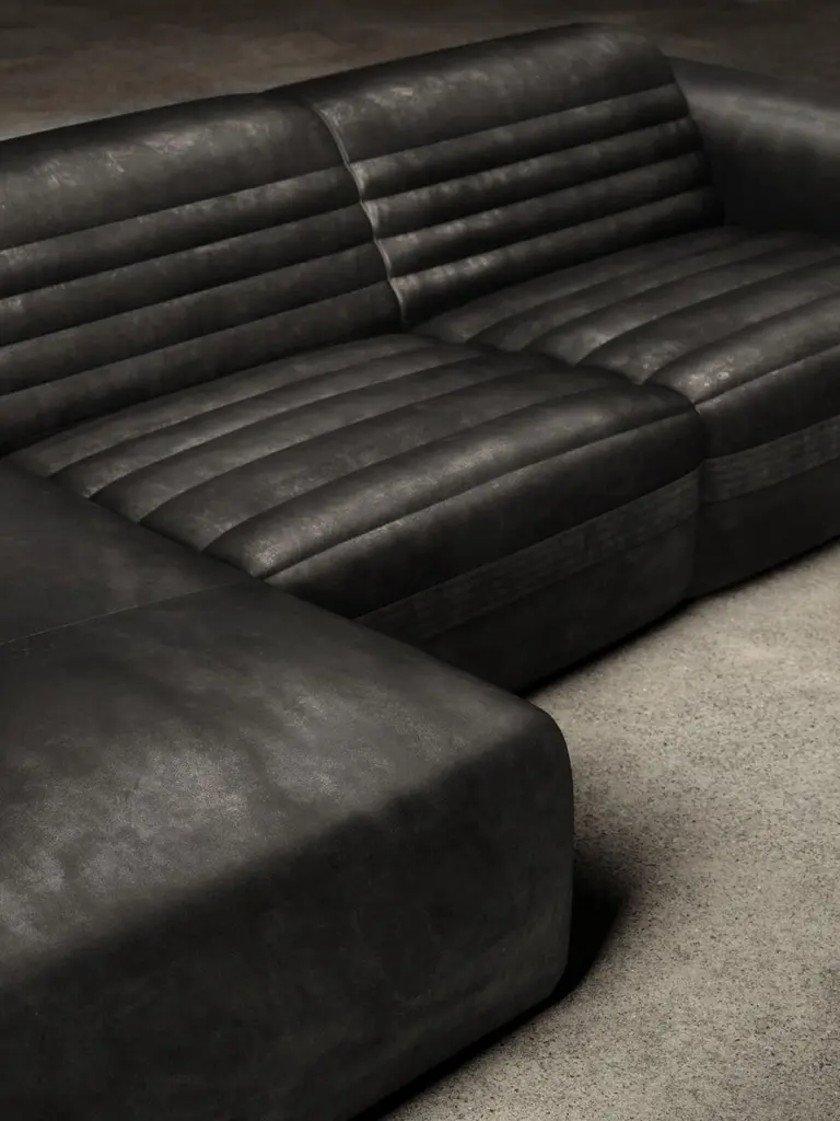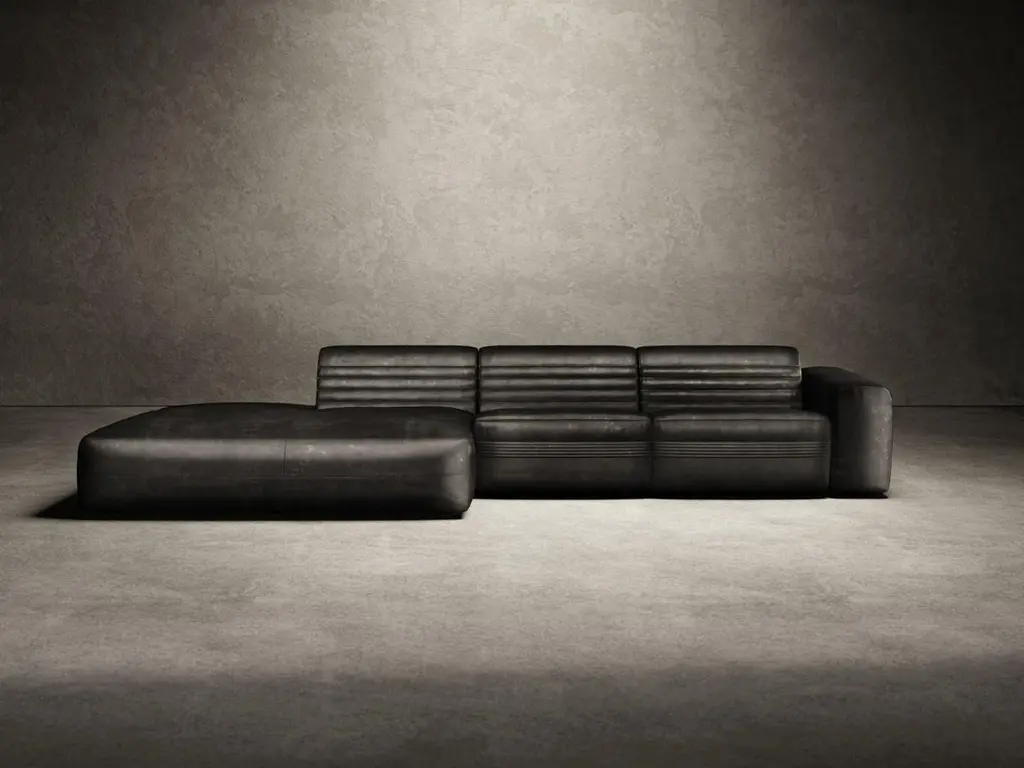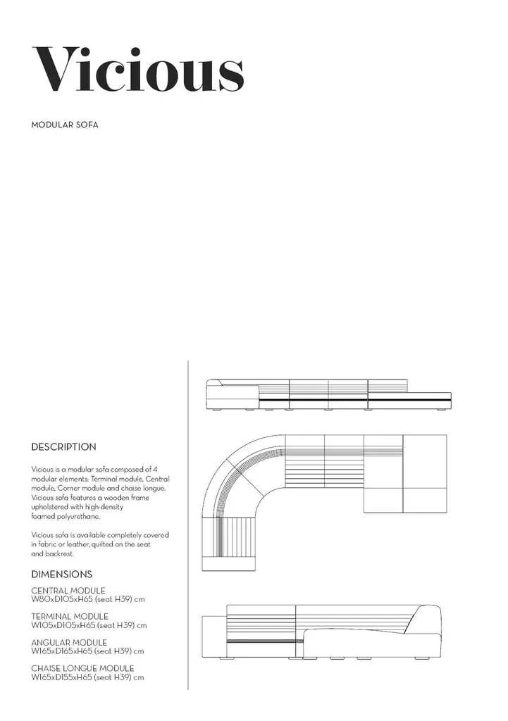 Vicious is a modular sofa composed of 4 modular elements: terminal module, central module, corner module and chaise longue. Vicious sofa is composed of a woode frame upholstered with high-density foamed polyurethane, and a top layer of goose down to ensure absolute softness and comfort. VICIOUS Sofa is available completely covered in fabric or leather, quilted on the seat and backrest.This configuration of Vicious is composed by one terminal module, one central module and a chaise long. The upholstery is Timeless Leather, which is chrome tanned, vacuum dired, finished with aniline, manually rubbed to give a stne washed effect and a soft touch.MODULE DIMENSIONS:Central Module_ W80 x D105 x H60 (seat H33) cmTerminal Module_ W105 x D105 x H60 (seat H33) cmAngular Module_ W165 x D165 x H60 (seat H33) cmChaise Longue Module_ W165 x D155 x H60 (seat H33) cm.