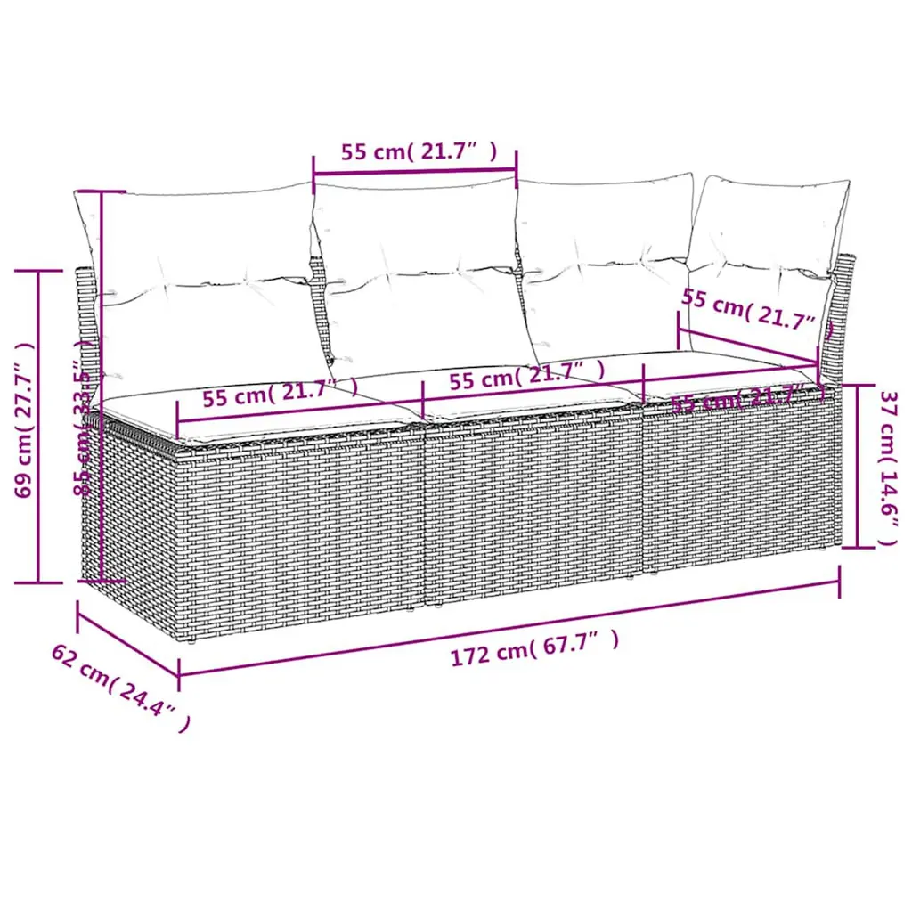 This 3-Seater Garden Sofa is all about chill and versatility, ideal for patios, gardens, or balconies. Made from top-quality synthetic poly rattan, it looks modern while giving you comfy outdoor lounging—great for gatherings or relaxed evenings with friends and family. Modular Design: You can rearrange the sofa to match your surroundings, be it a small balcony or a huge terrace. Change it up as your needs change. Weather-Resistant: Made with UV and water-resistant materials, this outdoor sofa stands up to the weather without losing its charm. Enjoy knowing your seat stays looking fab through all seasons. Spacious Seating: It comfortably fits up to three people, ensuring there's room for everyone to relax and chat. Integrated Storage: Comes with a handy waterproof bag for keeping your outdoor essentials tidy and dry. Removable Cushions: With removable covers, these cushions are easy to clean and keep fresh and comfy.