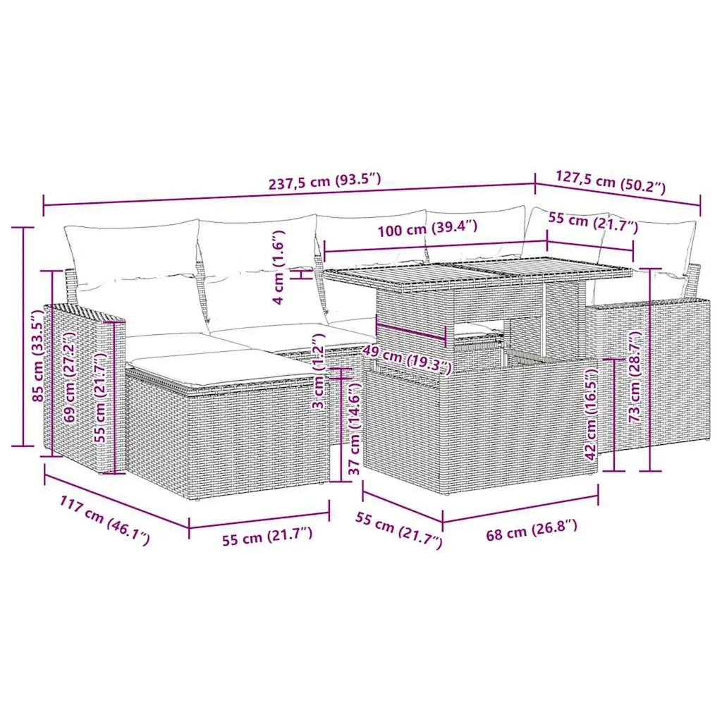 This 7 Piece Garden Sofa Set mixes modern style with comfy functionality, making it spot on for any outdoor space. With its trendy black and cream color scheme, this set brings a chic vibe to your patio, balcony, or garden, creating the perfect hangout to relax and entertain. Modular Design: This garden sofa set can be rearranged to match your space, whether you want a spacious lounge area or a cozy gathering spot. Weather Resistance: Made from PE rattan and powder-coated steel, the set holds up to various weather conditions, keeping its looks and function. Just remember to bring cushions inside when it rains, so they last longer. Ample Seating: With a capacity for up to 7 people, this sofa set is ideal for hosting outdoor events or just lounging in the sun. It comes with comfy cushions for a relaxed feel. Convenient Storage: Each part of the sofa has built-in storage, so you can stow cushions and other gear away when not in use, keeping your outdoor area tidy. Stylish Acacia Table: The included acacia wood table looks great and serves well for dining or drinks. Its adjustable height lets you change it from a coffee table to a dining table with ease.