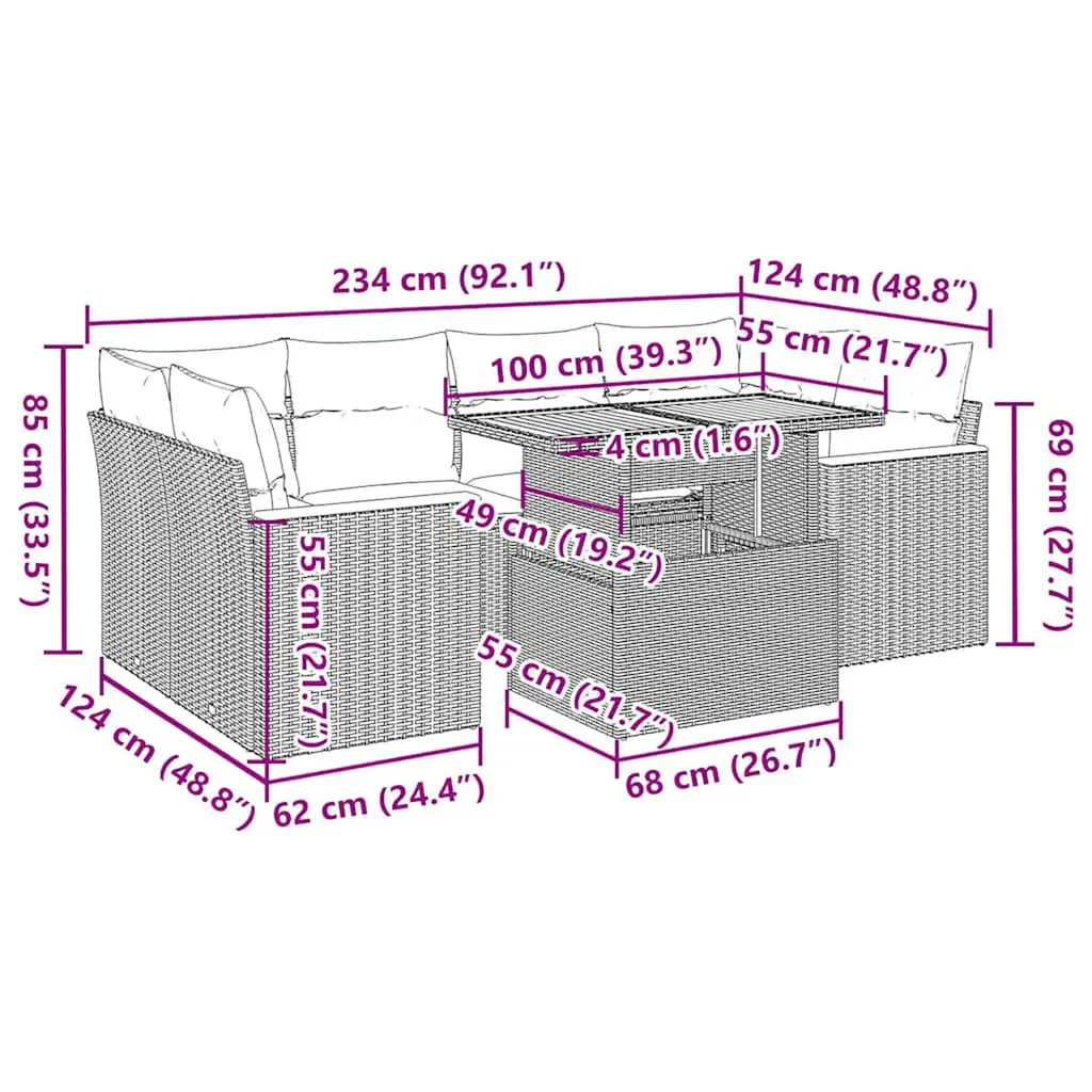 This 6-piece garden sofa set mixes modern style with practicality, making it perfect for a comfy outdoor lounge. Made from tough materials, it has a sleek black poly rattan finish that matches the solid acacia wood table, offering both comfort and good looks for parties or relaxing evenings outside. Flexible Modular Layout: The modular design can be easily reconfigured, making it ideal for any size gathering or outdoor layout, enhancing your garden experience.Generous Seating: Designed to seat up to six people, perfect for family gatherings, parties or just chilling with friends in a comfy environment.Durable with Storage Options: Each piece has built-in storage, a smart way to keep cushions and outdoor essentials safe and dry. Keep everything tidy and organized.UV and Water Resistant: Materials are made to withstand tough outdoor conditions, ensuring long-lasting beauty and function. Enjoy knowing your furniture stands up to sun and rain.Sophisticated Look: The mix of smooth textures in synthetic poly rattan and acacia wood adds a classy touch to any outdoor setup. This stylish set meets practical needs and lifts the vibe of your garden or patio.
