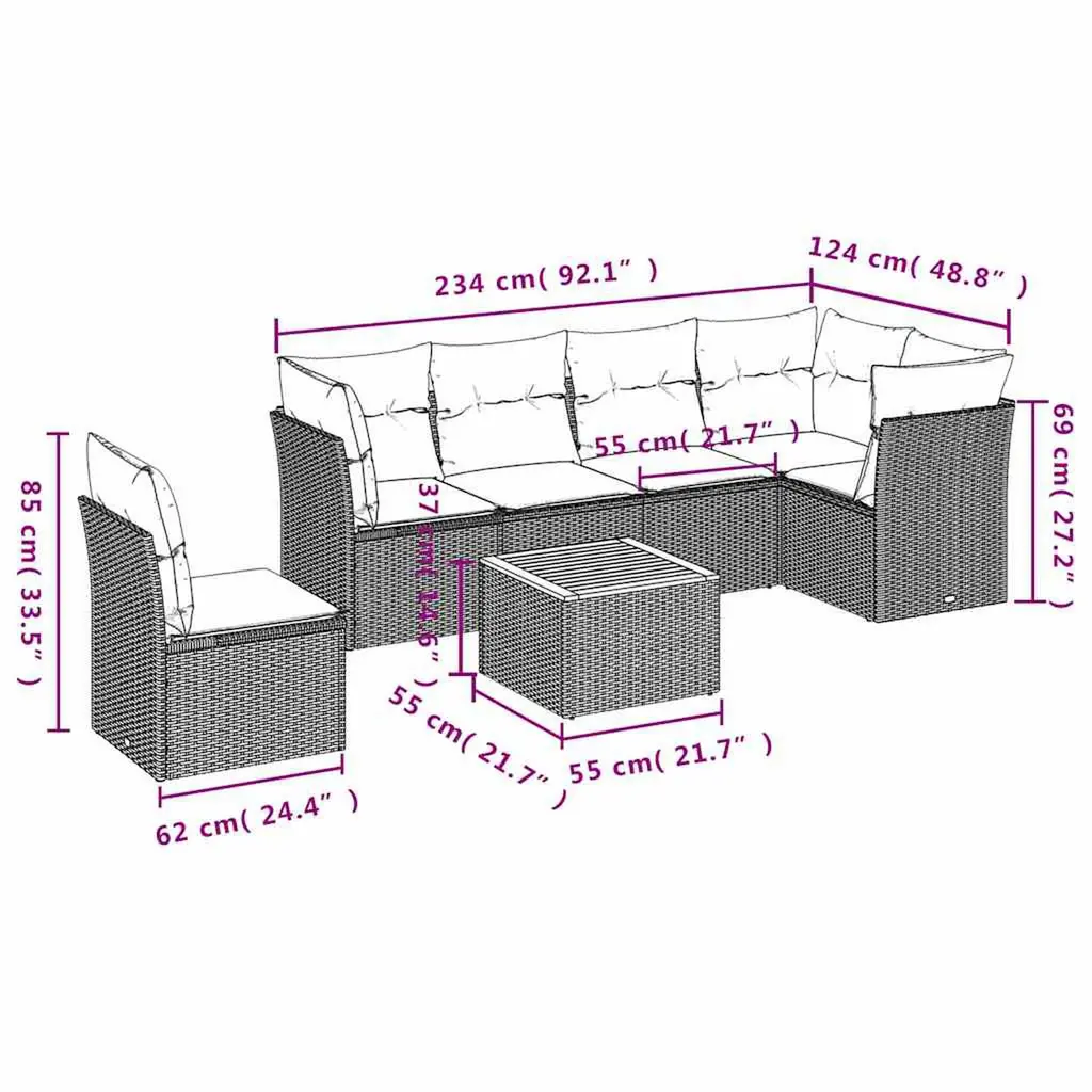 This 7 piece modular garden sofa set gives you a fantastic mix of style and usefulness, perfect for jazzing up your outdoor space while providing comfy seating. Its modern look, with clean lines and smooth surfaces, suits different patio designs, making it spot on for social gatherings or just chilling in the sun. 【Flexible Configuration】 The modular setup lets you rearrange the set into different configurations, fitting right into your outdoor space and occasions with ease. This feature makes it versatile, perfect for both lively events and quiet moments. Switch up your area for intimate chats or festive gatherings.【Integrated Storage】 Each seating unit has clever storage compartments underneath, perfect for keeping cushions, gardening tools, or other bits out of sight when not in use. This handy addition keeps things organized without losing style, making your outdoor area neater and more inviting.【Weather Resistant】 The materials used, including UV-resistant poly rattan, are built to handle all sorts of weather. This means you can leave the furniture outside without worries about rain or sun damage, making it perfect for any outdoor setting.【Durable Construction】 Made from high-quality solid acacia wood and powder-coated steel, this sofa set is built to last, supporting up to 110 lb per seat. Investing in this set means you get nice looks and peace of mind knowing it will last through many seasons.【Complete Seating Solution】 The set includes three corner seats, three center seats, a table, and plenty of cushions for both seats and backs, comfortably seating up to six people. Perfect for family gatherings or entertaining friends outside.