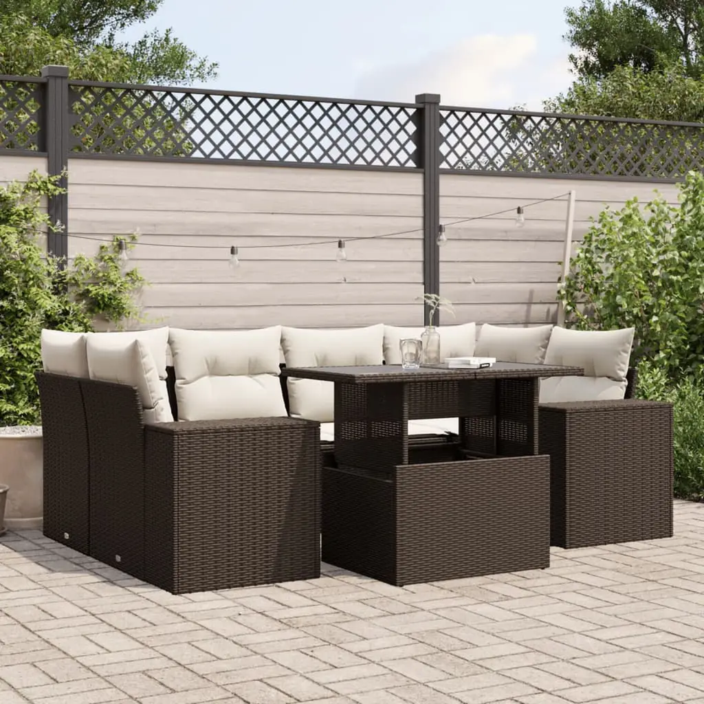 This 7-Piece Garden Sofa Set makes for a classy yet practical solution for enjoying outdoor spots. Made from top-notch poly rattan, this patio set has a lovely look and stands up to the outdoor conditions, letting you entertain friends and family in style. Modular Design: The modular structure of this garden sofa set lets you change the seating arrangement to match what you need, whether it’s a big gathering or a chill evening alone. It’s super flexible, perfect for all sorts of occasions and outdoor layouts.Weather-resistant Cushions: These cushions are removable and washable, made to hold up against the elements while still comfy. This quality not only boosts the use of your garden furniture but keeps it looking fresh for ages.Stylish Aesthetic: Its trendy design, with brown and cream colors, adds a nice touch to any patio or balcony. This garden set is not just for sitting; it also serves as a highlight in your outdoor style.Durable Materials: Built from UV-resistant poly rattan and tough powder-coated steel, this furniture set is made to last. The sturdy frame can hold up to 242.5 lbs, making it perfect for outdoor gatherings.Easy Assembly: Comes with straightforward assembly instructions and all you need, so you can set it up quickly and enjoy your new outdoor vibe without fuss.