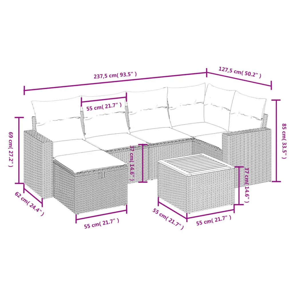 This 7-piece garden sofa set mixes style and comfort, perfect for hanging out and having a blast outside. With a modular design that you can switch around, it gives plenty of room for up to seven people, making it ideal for gatherings on balconies or patios and creating a relaxed vibe. Versatile seating arrangement: The modular design of this garden sofa set lets you configure it however you need. Perfect for patios, balconies, or gardens.UV-Resistant Materials: Built with UV-resistant synthetic Poly Rattan, this set stays vibrant and strong, even in the sun.Comfortable Cushions: Every seat has soft cushions with removable covers for easy cleaning, making your outdoor experience even better.Sleek Aesthetic: The smooth finish of solid acacia wood combined with a modern design makes this sofa set look stunning in any outdoor setting.Durable Frame: Made with a tough powder-coated steel frame, this sofa set is built to handle the elements, assuring comfy seating for all your gatherings.