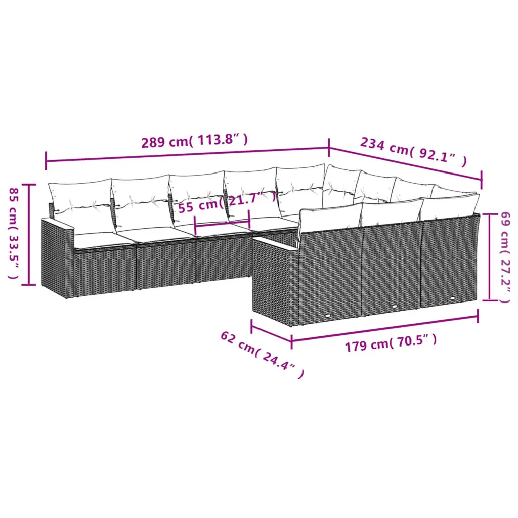This 10-piece garden sofa set is a stylish and modern way to seat outdoors, perfect for patios, balconies, or gardens. Made from tough poly rattan and solid powder-coated steel, it combines looks with function, giving you a comfy spot for relaxing and chatting under the sun. Made with Quality Stuff: This sofa set uses UV-resistant materials, ensuring it lasts and looks good even with sun exposure, making it a smart pick for any outdoor space.Flexi Layout: The modular design means you can rearrange it how you want, whether you’re hosting a crowd or just enjoying a quiet afternoon. This adaptability lets you tailor seating for different needs or occasions.All-Weather Cushions: The cushions use weather-resistant fabric and have zippers for easy removal, making cleaning a breeze. This keeps your seating looking fresh and inviting all year round.Great for Multiple Settings: This set is perfect for relaxed evenings under the stars or lively outdoor parties, catering for gatherings of all sizes. It fits plenty of guests while keeping things snug and friendly.Loads of Comfort: With seating for up to ten people, this sofa set has heaps of space for family and friends. It’s designed for comfort and style, making it a dream for outdoor fun.