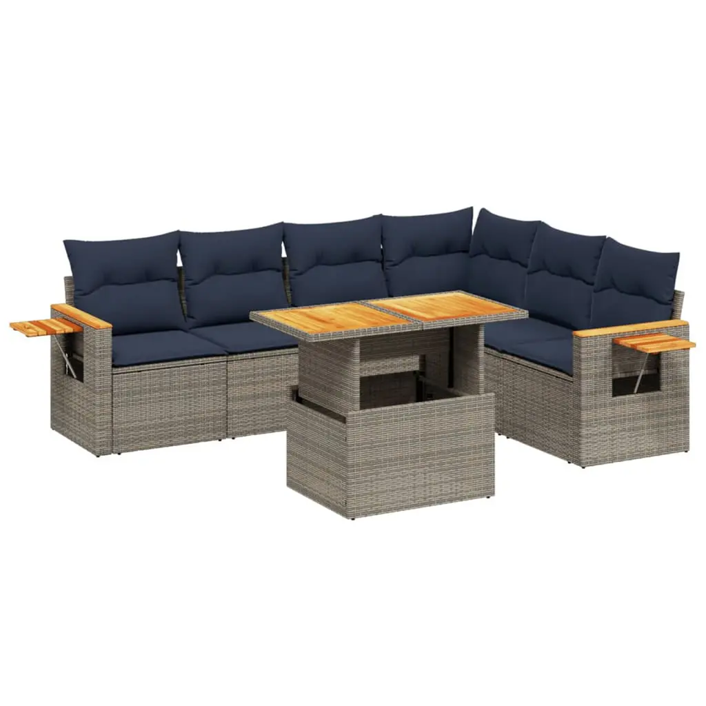 This 7-Piece Modular Garden Sofa Set adds a modern touch to any outdoor area, beautifully combining style and comfort. Made from durable poly rattan and featuring a versatile modular design, this set can be rearranged to suit your patio or terrace layout, perfect for both small and large gatherings. Spacious Seating: Designed for maximum comfort, this garden sofa set accommodates up to 7 people, letting you host gatherings with mates and family without feeling squished. The well-padded cushions mean everyone can enjoy outdoor relaxation in style.Durable Construction: Made from high-quality powder-coated steel and synthetic poly rattan, this set is built to last. The weatherproof materials make sure your investment is ready for the outdoors, offering lasting enjoyment.Stylish Aesthetics: With clean lines and a smart grey color, this modern set boosts the look of any outdoor area. It complements various outdoor settings from gardens to patios, showcasing a nice mix of style and practicality.Easy Maintenance: The removable covers are zip-secured, making it easy to keep them clean. You can maintain the cushions' freshness with minimal effort, ensuring they're always inviting for your guests.Customizable Layout: The modular design lets you set up the sofa pieces in different configurations to fit your space and needs. Whether you fancy a straight line or a cozy corner setup, personalization is easy!