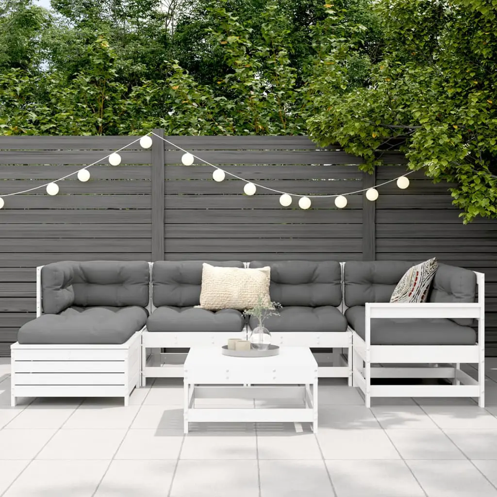 This 7-Piece Garden Sofa Set turns your outdoor space into a chill zone. With its trendy rectangular shape and sleek white finish, it’s perfect for gardens, balconies, or terraces—inviting you to relax with family and friends. This sofa set's modular design lets you configure it your way, making it perfect for both gatherings and quiet moments outside. The slatted frame encourages ventilation, keeping things comfy and dry, perfect for outdoor use. Made from solid pine wood, it’s sturdy and can handle a lot while showing off its lovely natural look. With a max seating capacity of seven, it’s spot on for chats at outdoor parties or peaceful evenings under the stars. Its smooth finish combines looks and protection, so it stays fantastic indoors and out for ages.