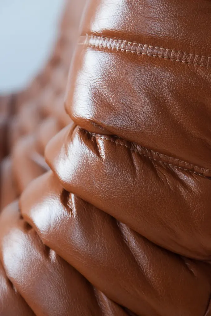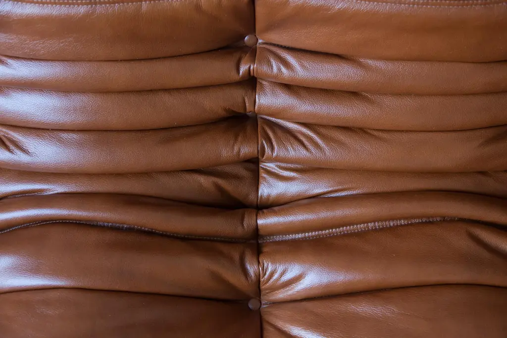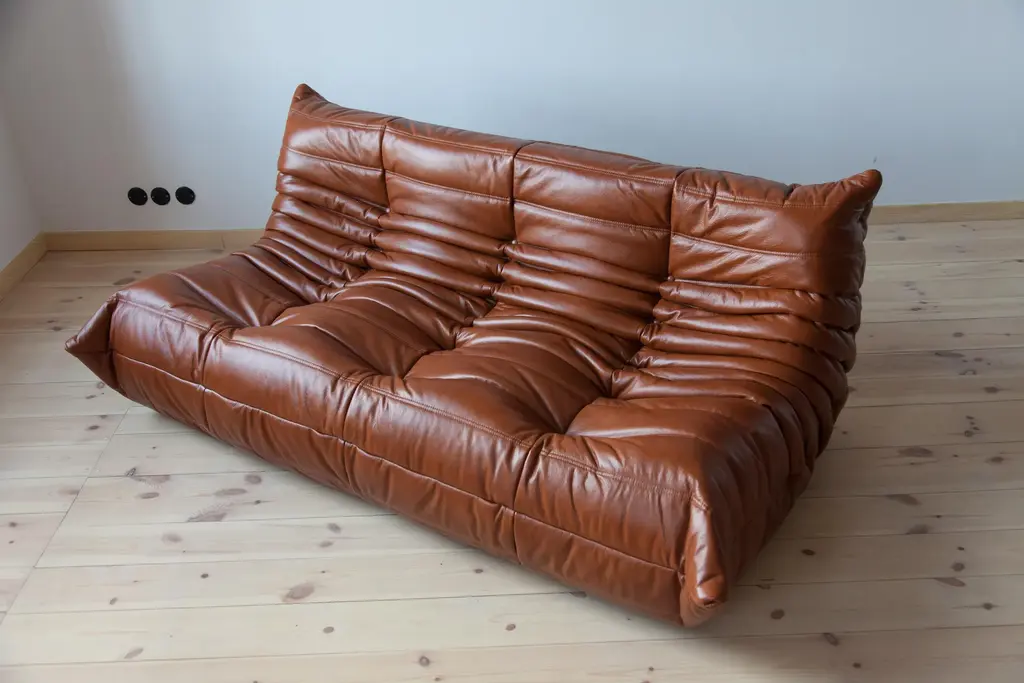 Timeless design by Michel Ducaroy for Ligne Roset in 1973 in France. These three couches have been reupholstered in high quality new leather, whiskey brown color. All three contain original Ligne Roset label and original bottom. The set consist of three seat couch (70 x 174 x 102cm) two seat couch (70 x 131 x 102cm) and corner couch (70 x 102 x 102cm) I have official proof of authenticity such as vintage catalogs, designer records, or other literature sources and take full responsibility for any authenticity issues arising from misattribution