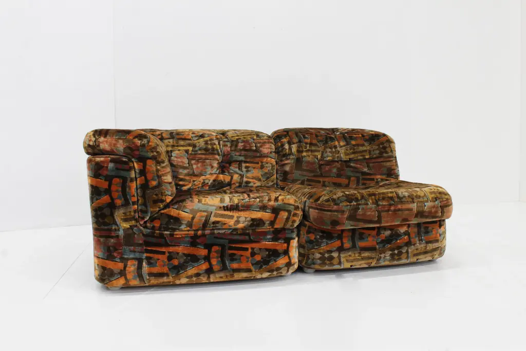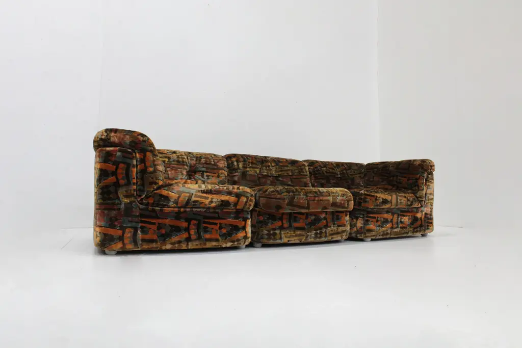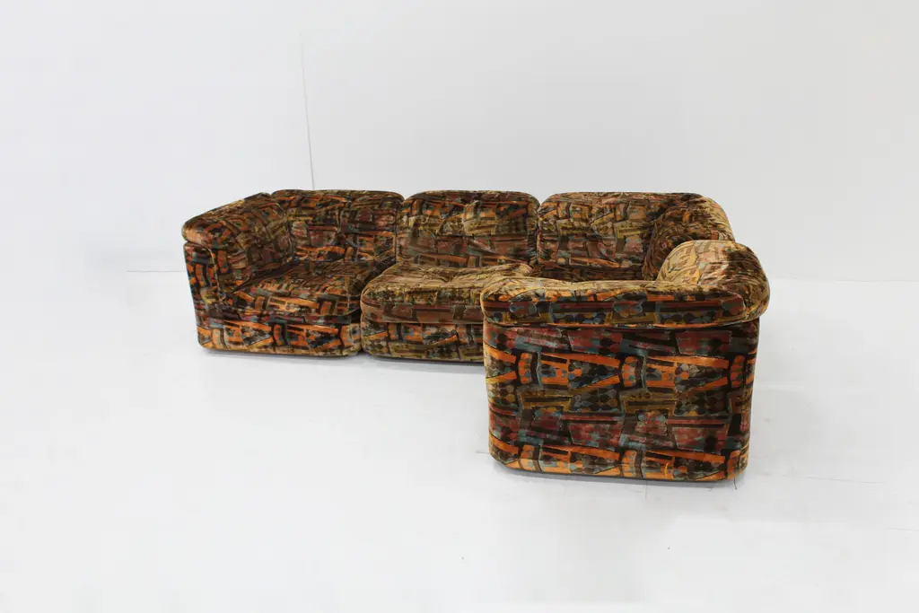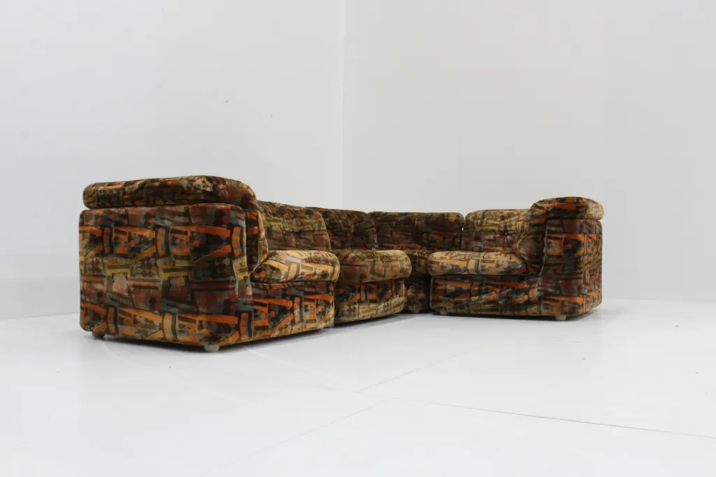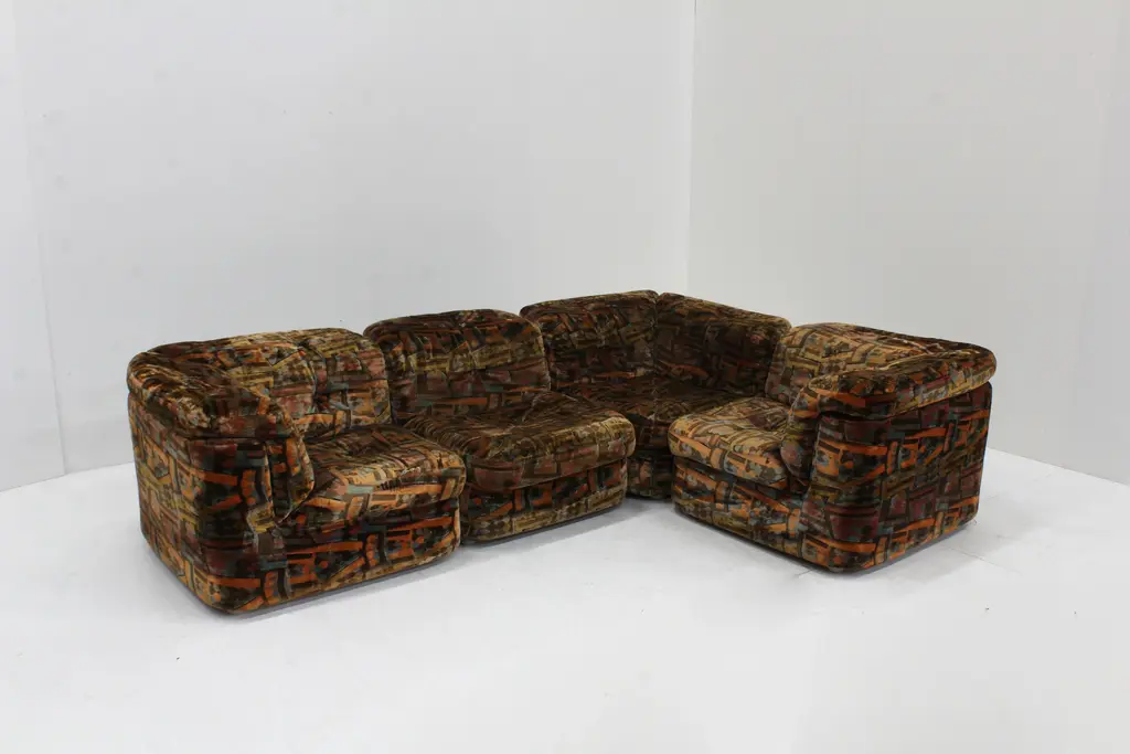 Vintage Modular corner Sofa with beautiful colorful fabric from the 1970s. This modular sofa consists of 4 elements including 3 corner elements. Funky colorful fabric and very comfortable! Extra lounging due to the 3 corners. Color palette: Brown, orange, blue, pink, yellow. The position of the sofa can be adjusted to your interior, move the elements as desired. Vintage traces of use consistent with age, some parts are faded. Dimensions photo: 180 cm by 254 cm 1 element: Width 90 cm, depth 90 cm, height 69 cm 180 cm by 254 cm