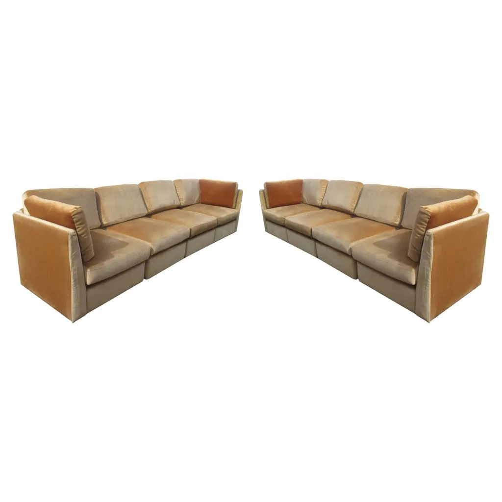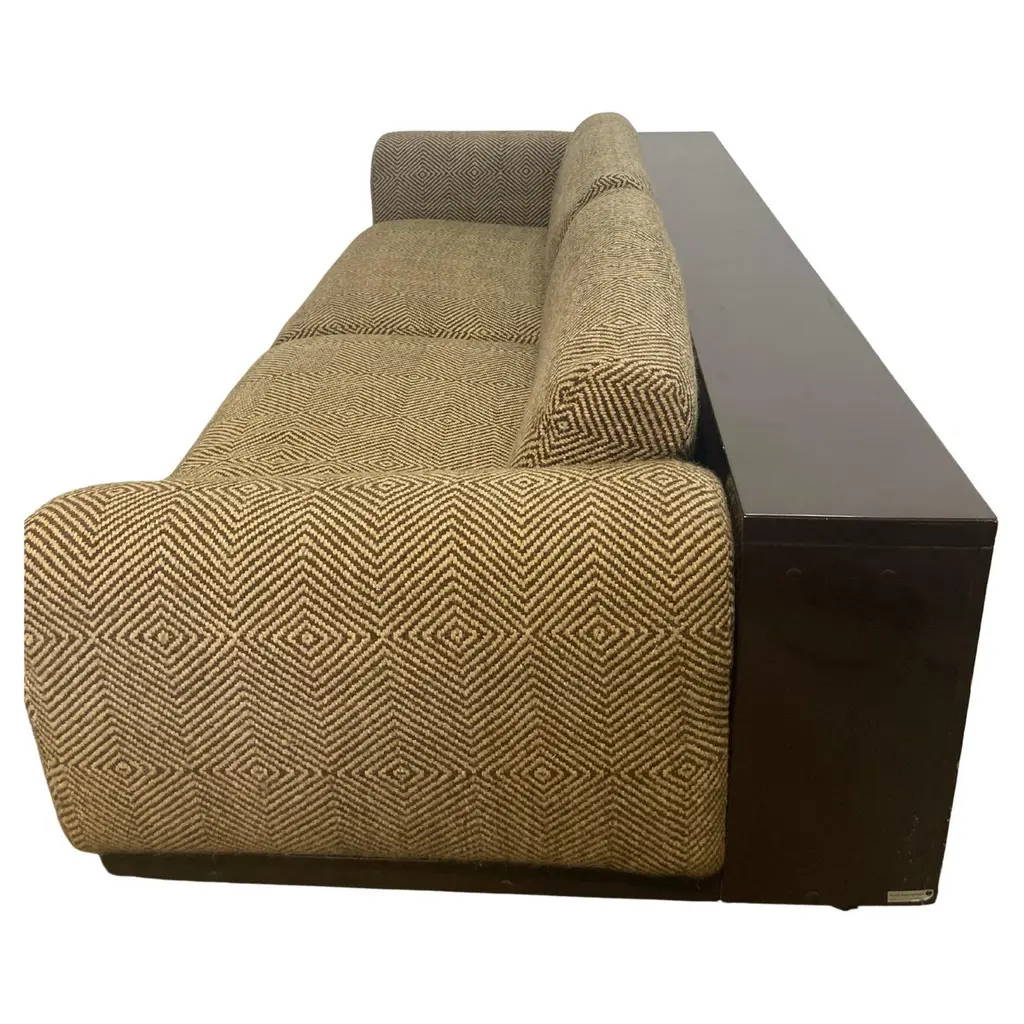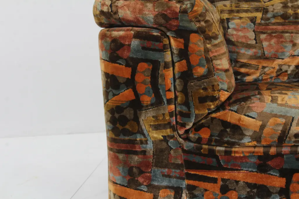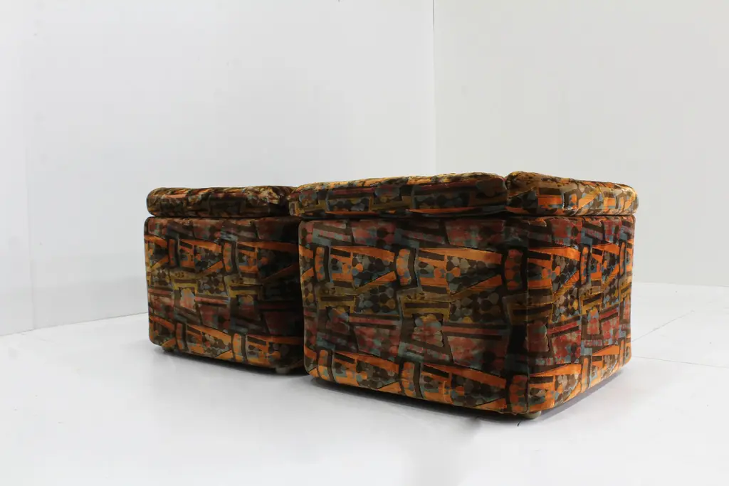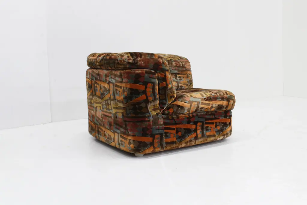 Vintage Modular corner Sofa with beautiful colorful fabric from the 1970s. This modular sofa consists of 4 elements including 3 corner elements. Funky colorful fabric and very comfortable! Extra lounging due to the 3 corners. Color palette: Brown, orange, blue, pink, yellow. The position of the sofa can be adjusted to your interior, move the elements as desired. Vintage traces of use consistent with age, some parts are faded. Dimensions photo: 180 cm by 254 cm 1 element: Width 90 cm, depth 90 cm, height 69 cm 180 cm by 254 cm